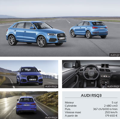 L’Audi Q3 a été conçue pour répondre à de nouveaux besoins. Cinq cylindres de pure puissance, associés à une conduite encore plus dynamique : voici ce que vous offre l'Audi RS Q3 performance. La puissance du moteur 2.5 TFSI de l’Audi RS Q3 a été augmentée de 27 ch pour atteindre 367â¯chevaux. Ainsi, l'Audi RS Q3 performance passe de 0 à 100 km/h en seulement 4,4 secondes, et affiche une vitesse de pointe de 270â¯km/h.
