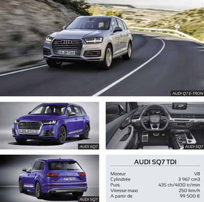 Le design de cette 2e génération est plus sculptural, plus athlétique. Calandre Singleframe 3D, conduite surélevée et design sculptural… l’Audi Q7 réinterprète les codes du SUV dans un style plus contemporain Le moteur V8 4.0 TDI de l’Audi SQ7 délivre une puissance de 435 ch et un couple impressionnant de 900 Nm, soit presque 100ch de plus que l’Audi SQ5 TDI plus.