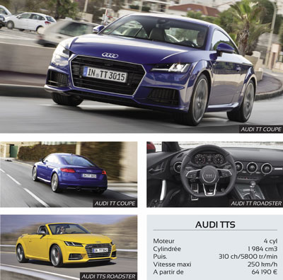 Une silhouette reconnaissable entre mille, un design mythique. L’Audi TTS fait preuve d’une grande force de caractère et d’une sportivité sans s’encombrer du superflu. La sportivité dans l’âme. Au cœur de l’Audi TTS Coupé se trouve un moteur 2.0 TFSI développant une puissance 310 ch. Il ne lui faut pas moins de 4,7 secondes pour passer de 0 à 100 km/h. Existe en version coupé et roadster.