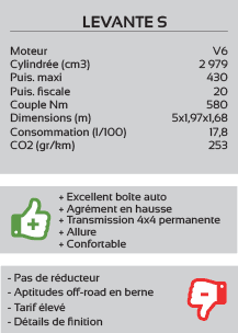 Mais la vraie nouveauté - qui constitue un véritable sacrilège aux yeux des puristes - c'est l'arrivée d'un moteur diesel sous le capot d'une Maserati. Il s'agit en l'occurrence du V6 3 litres VM (pour Venezia Motori, propriété du groupe Fiat Chrysler) animant déjà le Grand Cherokee. Modifié par le département moteur Maserati, mais pas encore Euro6, ce bloc voit sa puissance passer de 241 à 275 ch.