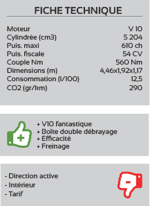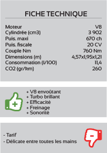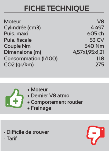 Sa puissance maximale est de 740 CV à 8 250 tr/min, pour une puissance de sortie spécifique de 118 CV/l, un record pour ce type de moteur. Le couple maximal de 690 Nm, disponible à 80 % dès 2 500 tr/min offre une réactivité et une reprise impressionnantes.