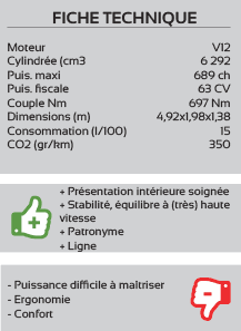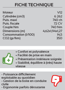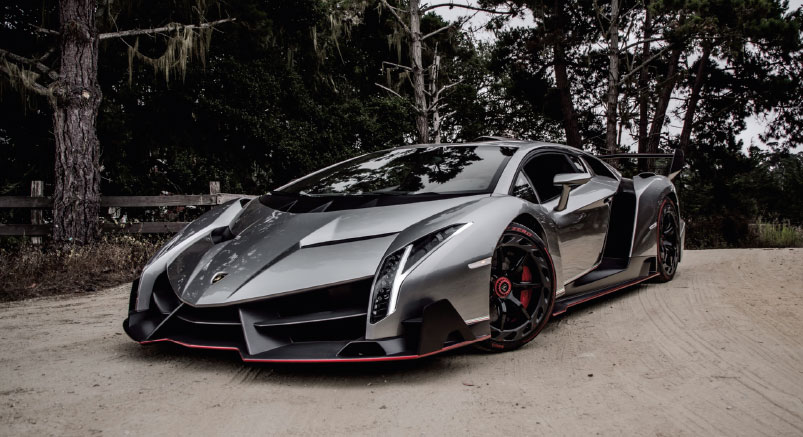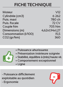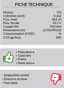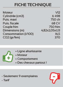 Pour les puristes, Veneno signifie en espagnol venin. La Veneno possède une ligne de guerrière avec des chevaux partout ! Une carrosserie taillée à la serpe, extrapolée de lAventador en plus agressive, cest peu dire ! Sous le capot, on retrouve le V12 de 6,5 l pour 750 chevaux, propulsant lensemble à plus de 355 km/h et un fantastique 0 à 100 km/h en 2,6 s Si le coupé nest plus commercialisé au catalogue du constructeur, il reste encore la Veneno Roadster, avec les mêmes prestations et les mêmes performances, mais aussi, hélas, le même tarif, soit plus de 3,3 millions deuros !