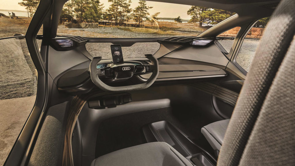 L’habitacle ultra-moderne est davantage adapté pour deux personnes, avec deux vrais sièges à l’avant, et des sièges montés en hauteur à l’arrière. La visibilité semble limitée compte-tenu de la zone bagage située devant le volant, malgré de grandes surfaces vitrées. Les aides à la conduite sont de niveau 4, un haut niveau d’automatisatisation, ce qui en fait un véhicule tout-terrain autonome. Certaines situations en terrain difficile pourraient même être gérées avec un niveau moindre, mais l’auto conserve bien évidemment un volant et des pédales (accélération et frein).