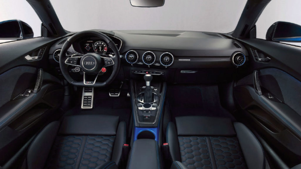 Dans l’habitacle, l’Audi R8 restylée évolue peu. Plutôt polyvalente, l’Audi R8 embarque un tableau de bord numérique et un système multimédia de qualité, mais le bouton de démarrage rouge pétant et le volant à méplat suggèrent une véritable sportivité. Parmi les équipements de série, on retrouve les feux arrière à LED, la climatisation automatique, les sièges chauffants, l’aide au stationnement, le régulateur de vitesse ou encore le fameux Audi Virtual Cockpit.