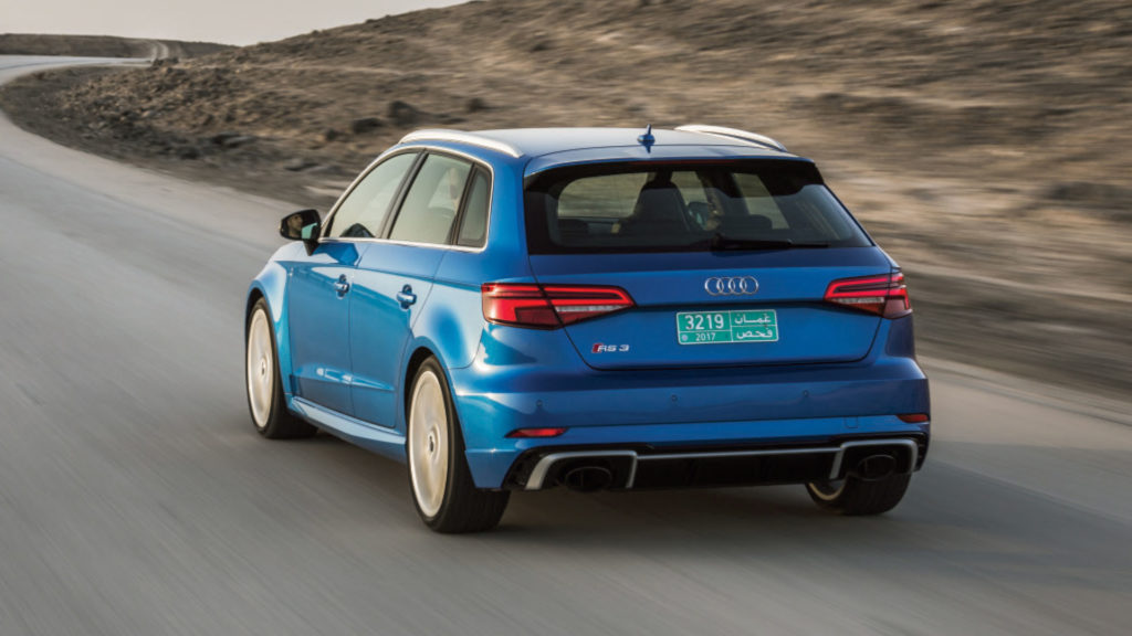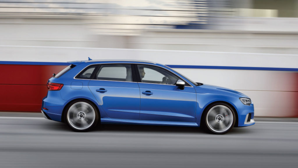 Dans l’attente de la future génération de l’Audi A3, les premiers prototypes d’une future RS3 ont déjà été espionnés. Quoiqu’il en soit, l’Audi RS3 Sportback est notre entrée de gamme dans la famille RS. Et, comme la plupart des modèles de la gamme RS d’Audi, la sportivité est au rendez-vous. Avec une calandre SingleFrame en nid d’abeille et des larges entrées d’air, ou encore des pare-chocs RS profilés. Plusieurs éléments permettent de la distinguer : becquet de toit ou encore les fameuses sorties d’échappement ovales.
