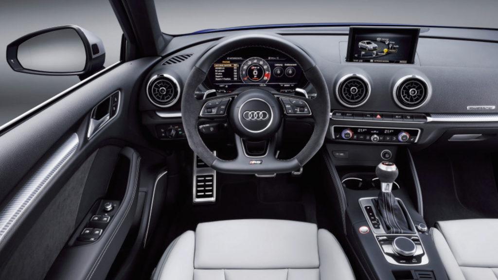 Dans l’habitacle de cette compacte, la sportivité vous accueille une fois installé. À commencer par le volant RS à méplat, recouvert d’alcantara. La sellerie est spécifique aux modèles de la gamme RS, avec des sièges sport S en cuir Nappa, offrant un parfait maintien. L’Audi RS3 Sportback possède l’Audi Virtual Cockpit, elle aussi, bien qu’elle semble se faire un peu vieille. Avec un volume de chargement de 335 L, elle est bel et bien la plus compacte de la gamme RS que nous vous présentations dans ce dossier.