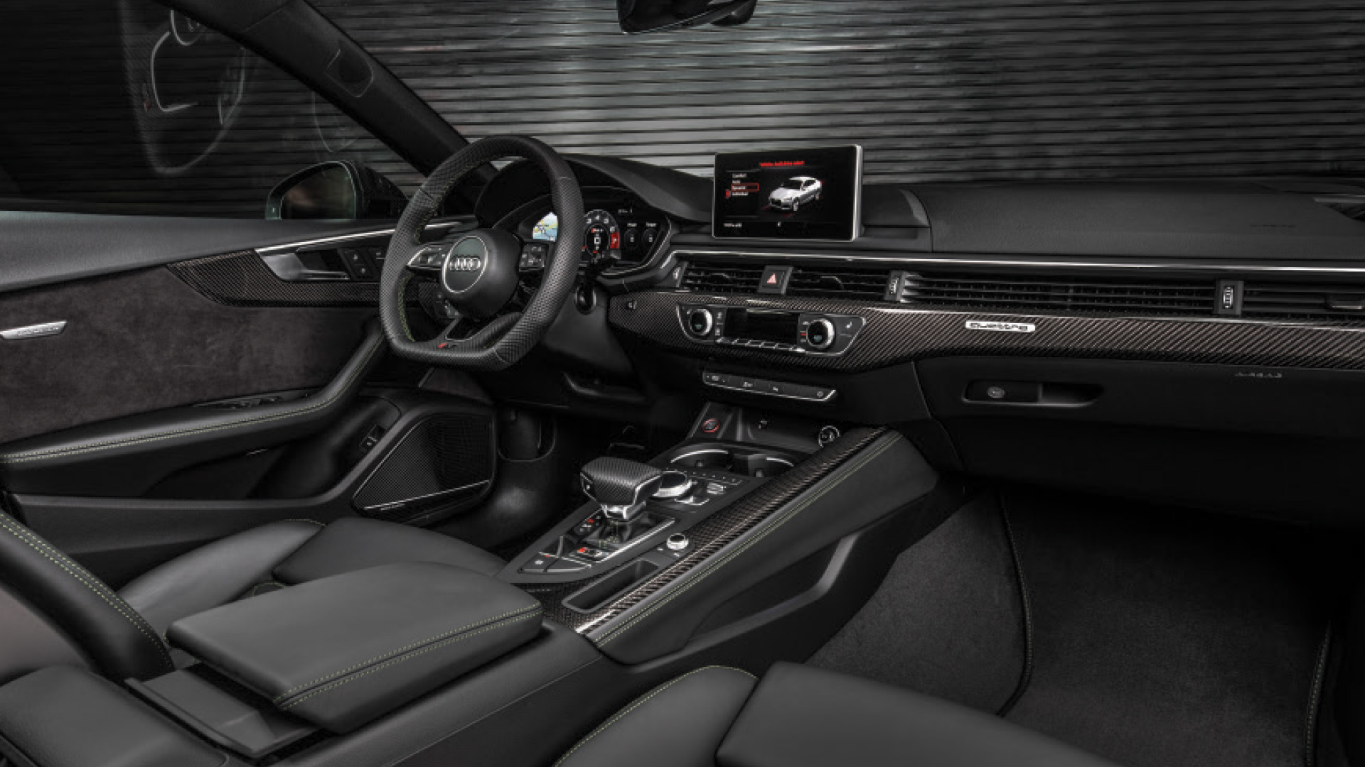 À l’intérieur, l’habitacle reste très germanique, très sobre. Quelques rares éléments carbone ou les surpiqûres et badges RS viennent donner un tempérament sportif au modèle. Les sièges baquets sont, eux, en option. Côté pratique, l’Audi RS5 Sportback bénéficie d’un coffre avec hayon de 480 Litres, ce qui n’est pas rien. Niveau motorisation, le moteur reste identique au coupé. Il s’agit toujours du V6 2,9 L biturbo développant 450 chevaux et un couple de 600 Nm. Ceci permet à l’allemande d’abattre le 0 à 100 km/h en 3,9 secondes. La boîte de vitesse est automatique à 8 rapports (boîte Triptronic). Une fois n’est pas coutume dans la gamme RS, la nouvelle Audi RS5 Sportback bénéficie de la transmission intégrale Quattro. Petit détail aussi geek qu’inutile, le Virtual Cockpit d’Audi propose un mode d’affichage spécifique à la gamme RS. Pour se la procurer, un peu de patience. Tout d’abord réservée aux marchés nord-américain et canadien, cette allemande devrait arriver en Europe au second semestre 2018.