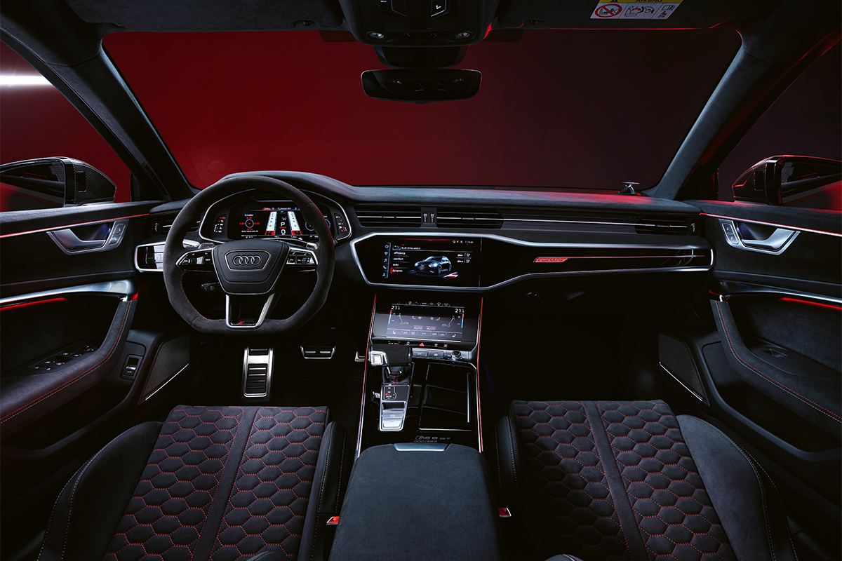 Dans l’habitacle, tout passé à la personnalisation dans cette édition limitée. On y trouve l’inscription RS6 GT brodée à bien des endroits, avec surpiqûres rouge et cuivre. Le conducteur est confortablement installé dans de nouveaux sièges baquets RS et retenu par une ceinture rouge carmin. L’alcantara et le cuir Dinamica sont omniprésents.