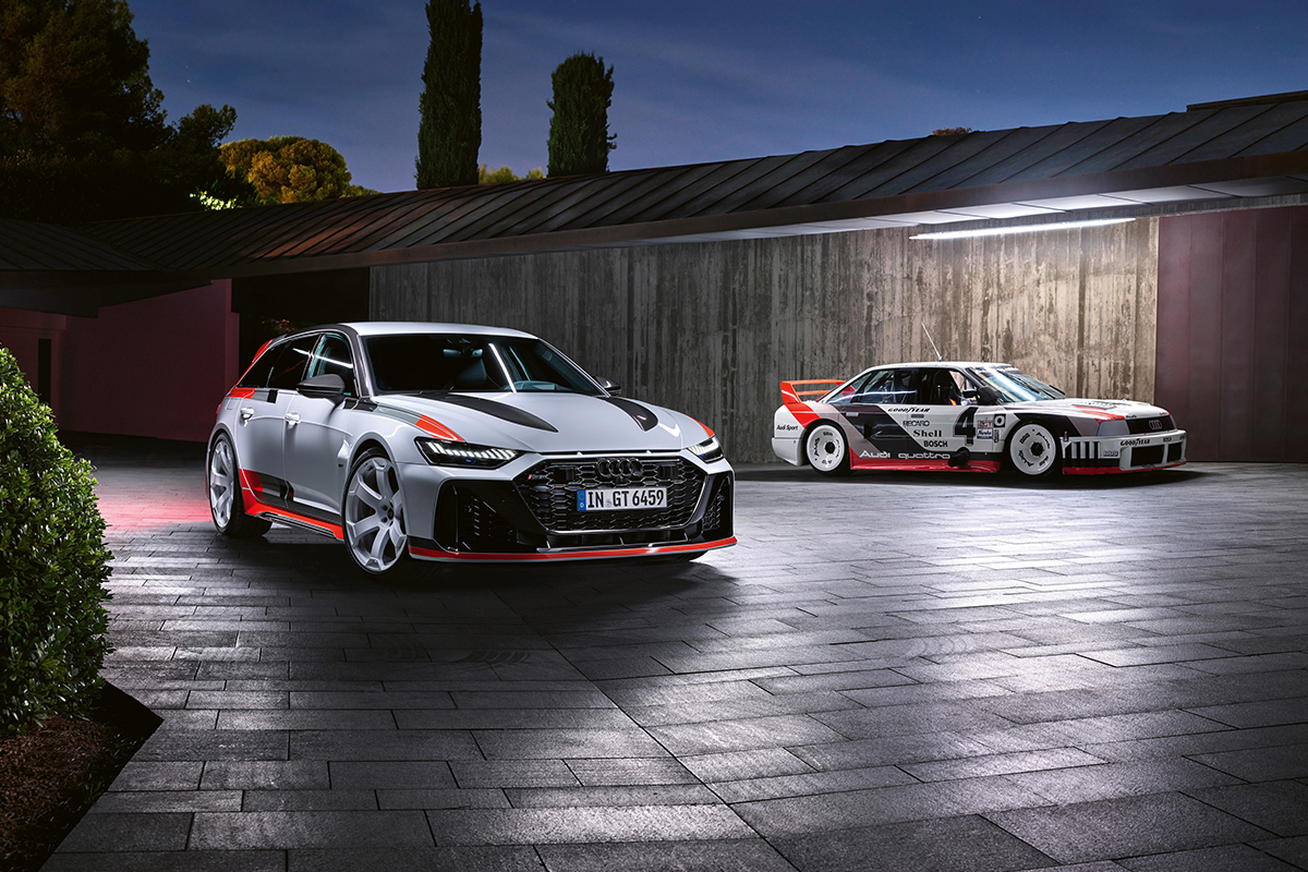 Pour la première fois, Audi utilise un châssis fileté de série, qui abaisse l’auto, réglable manuellement afin d’offrir à la fois confort ou dynamisme (châssis sport RS optionnel). L’auto est fortement inspirée du projet RS6 GTO de 2020, ce qui explique notamment sa livrée si particulière et son look. On reconnaît la RS6 Avant GT avec sa calandre Singleframe et ses prises d’air peintes en noir brillant, renforçant l’agressivité de cette face avant qui intègre de nouvelles entrées d’air. Pour la première fois, de la fibre de carbone est utilisée pour fabriquer le capot, comme en témoigne ces deux protubérances sur la pièce, mises en exergue par la livrée Audi Sport blanc, gris et rouge. Quant à l’arrière, on repère un immense diffuseur avec réflecteur vertical ainsi que le double aileron inspiré du sport auto.