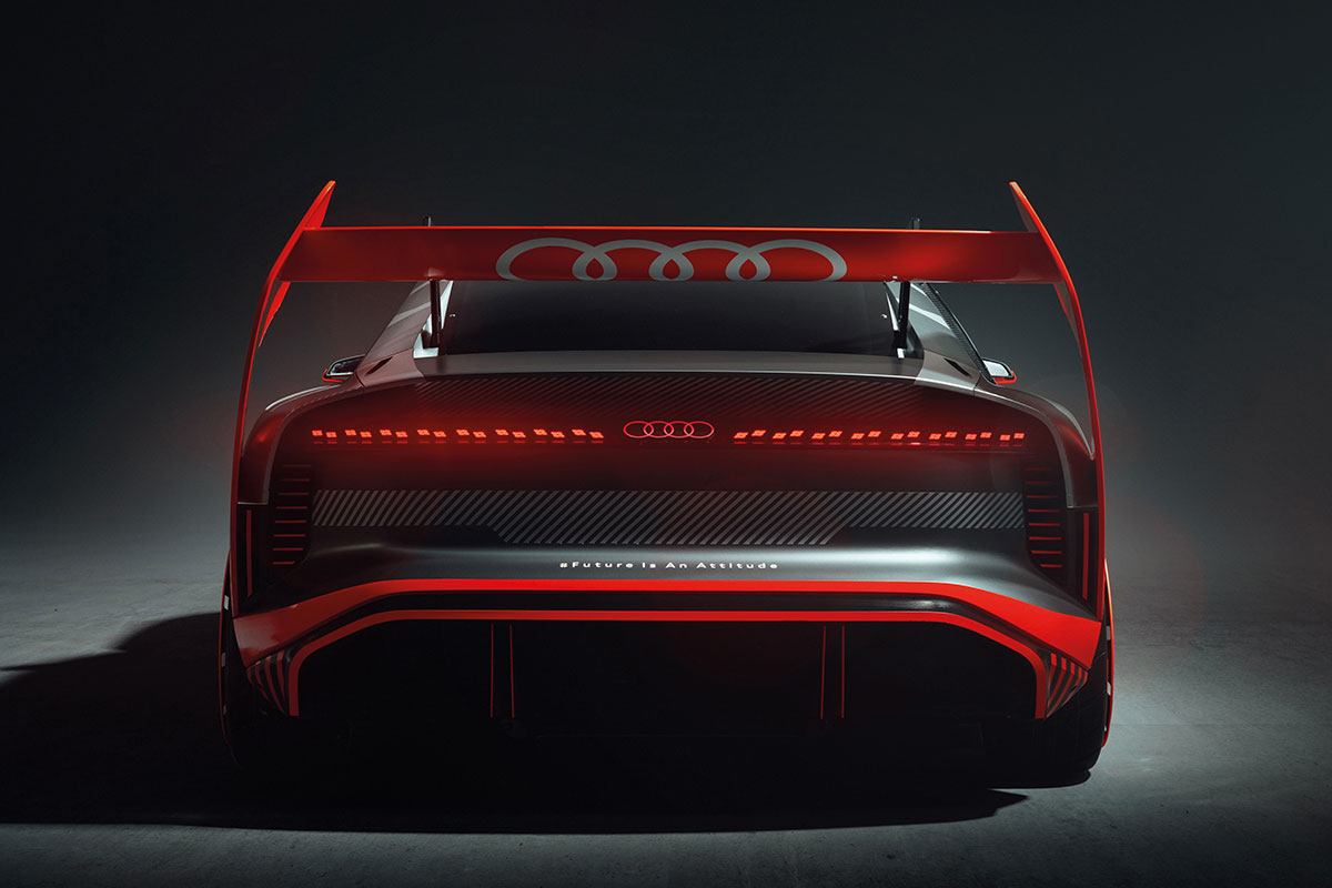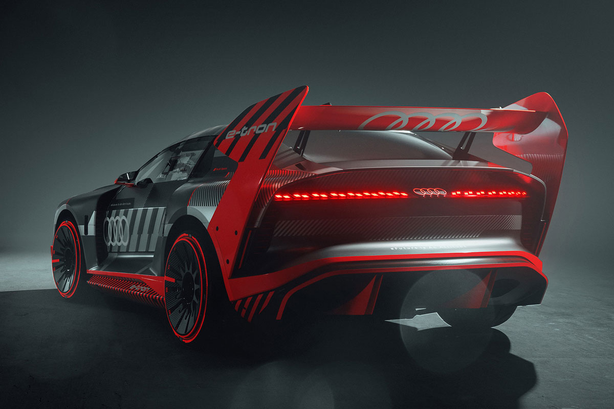 De grandes entrées d’air viennent refroidir les batteries, tandis qu’une poupe similaire à celle de leur véhicule d’endurance RS Q e-Tron. Parlons-en, de l’arrière, avec cet immense aileron fixe annonçant de sacrés performances (sur lesquelles Audi et Ken Block n’ont pas encore communiqué publiquement).