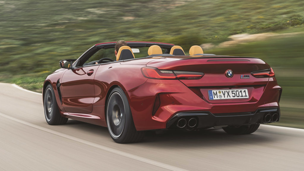 Avec un gabarit somme toute semblable aux autres cabriolets de notre classement, la M8 cabriolet semble aussi sportive que son moteur le suggère. Des jantes 20 pouces assoient la voiture. Des grosses prises d’air, un nouveau spoiler avant, becquet arrière et diffuseur, de nombreux éléments carbone ainsi que quatre larges sorties d’échappement ne laissent planer aucun doute : la M8 est un cabriolet monstrueux. Le système de déploiement du toit (capote électrique) rajoute un poids non négligeable au coupé, mais sans réellement impacter les performances.