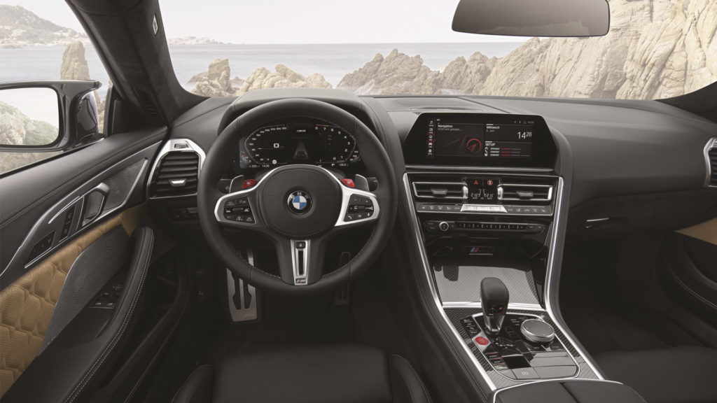 Dans l’habitacle, le confort est évidemment de mise. Des habillages spécifiques aux M sont également proposés. Plusieurs boutons physiques d’un rouge pétant apparaissent sur le volant et la console centrale. L’équipement de série comprend l’affichage tête-haute, l’aide au parking active, ainsi qu’une clé intégrant un écran interactif vous donnant des infos sur l’auto.