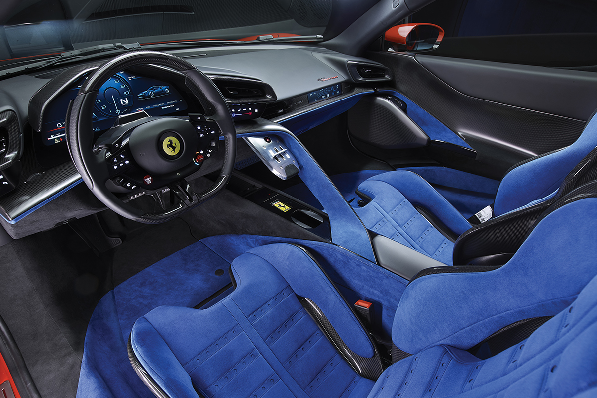 L’auto se pose comme la remplaçante de la SF90, avec qui elle partage le châssis et les dimensions. Sa silhouette évoque une petite F80 et la face avant n’est pas sans rappeler la récente 12Cilindri avec son bandeau noir intégrant des feux de jour, tandis que sa double bouche est un véritable défi aérodynamique. Le flanc de l’auto intègre une bande noire en fibre de carbone qui met en exergue une aération creusée dans la porte, venant refroidir le V8 thermique. La partie arrière, avec ses deux petites ailettes intégrées au bouclier qui rappellent les Ferrari 512 des années 70, est particulièrement réussie. Les feux arrière sont fins et discrets alors que la double sortie d’échappement est impressionnante. Le pack optionnel Assetto Fiorano vous permet de gagner 30 kg et de bénéficier d’un look extérieur plus agressif avec deux petits ailerons façon FXXK remplaçant les ailes intégrées (ajoutez environ 50,000 euros à votre facture).