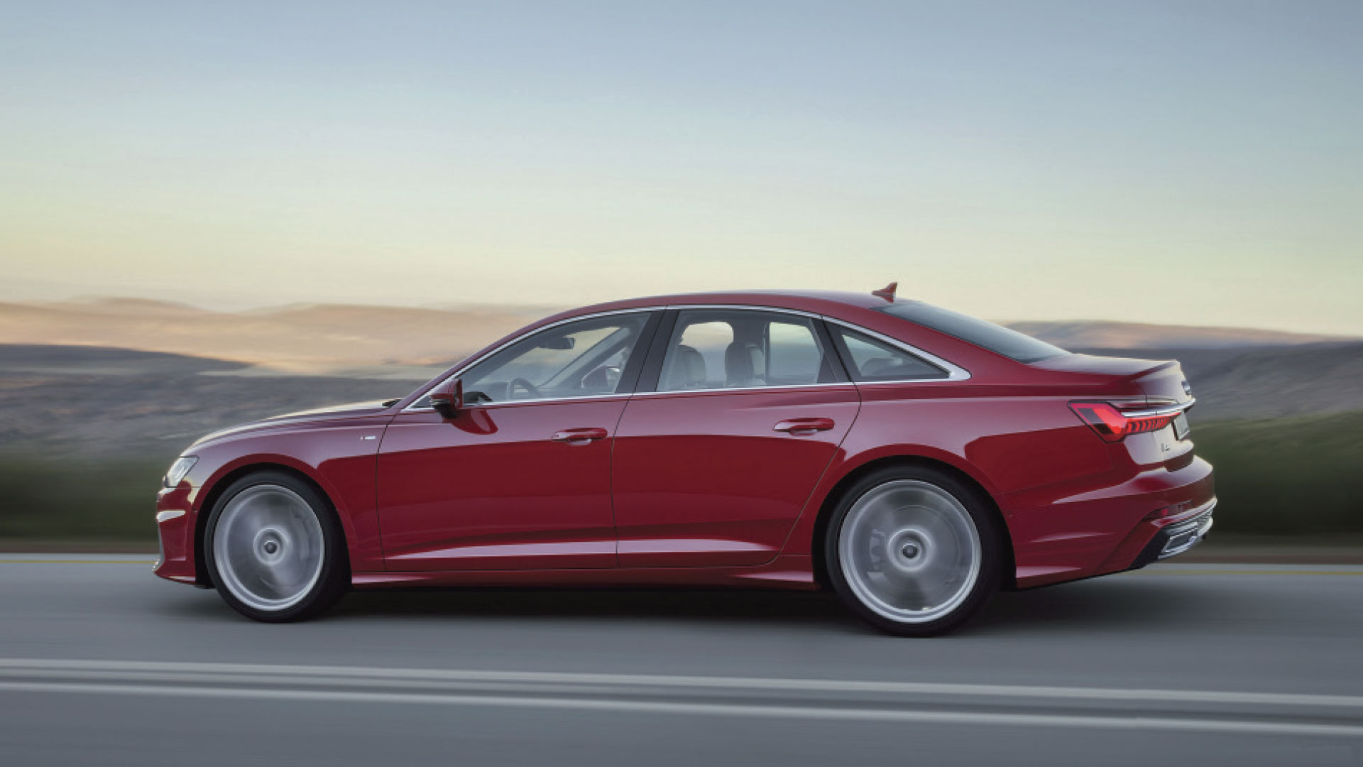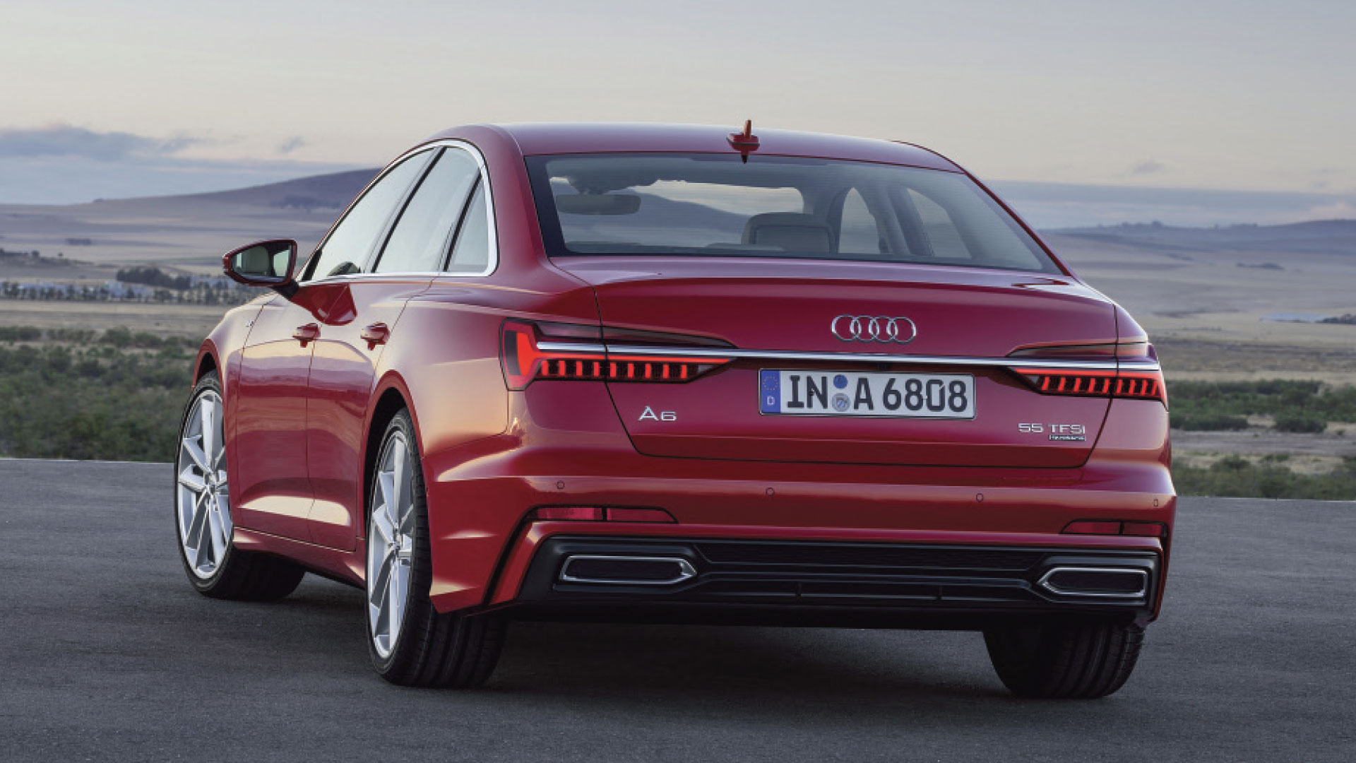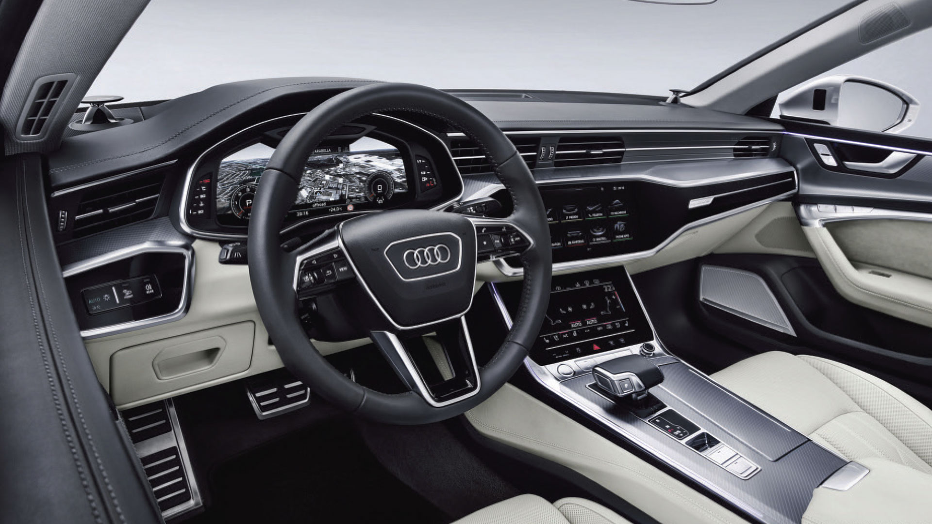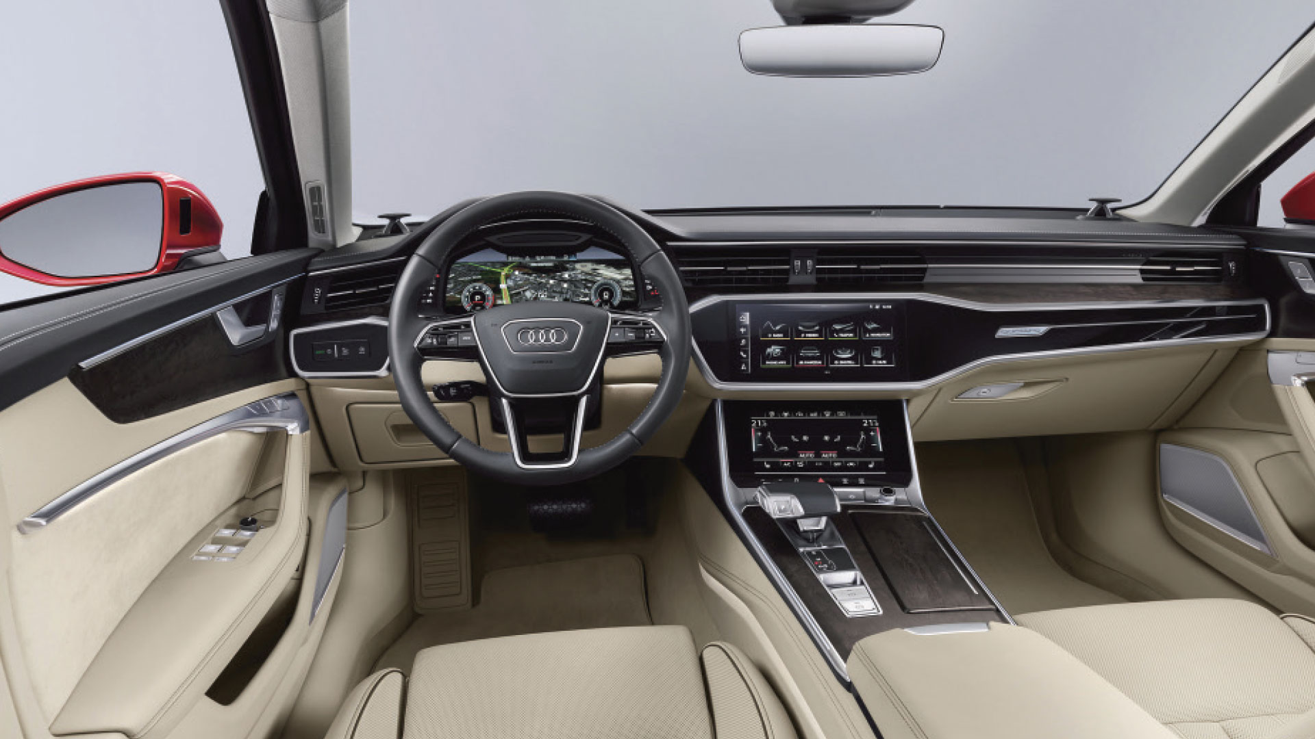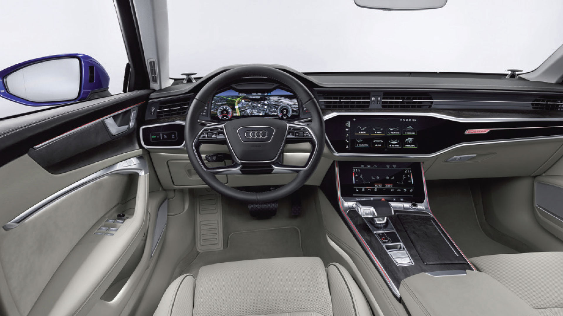 Prises d’air avant, calandre Singleframe. Petit détail luxe : les phares sont reliés par une bande chromée sur toute la largeur. Mis à part ce détail, l’Audi A6 Berline possède un style proche des A7 Sportback et Audi A8. À l’intérieur, nous trouvons un habitacle digital et futuriste, et surtout plus vaste (la garde au toit et l’espace au niveau des jambes progressent). Les dimensions intérieures augmentent et permettent de jouir de la meilleure des façons des différentes atmosphères créées par l’éclairage. Audi nous parle de révolution intérieure. En effet, l’instrumentation passe au tout-numérique, avec un double écran tactile. L’Audo possède jusqu’à 23 capteurs dédiés aux aides à la conduite (au nombre de 38).