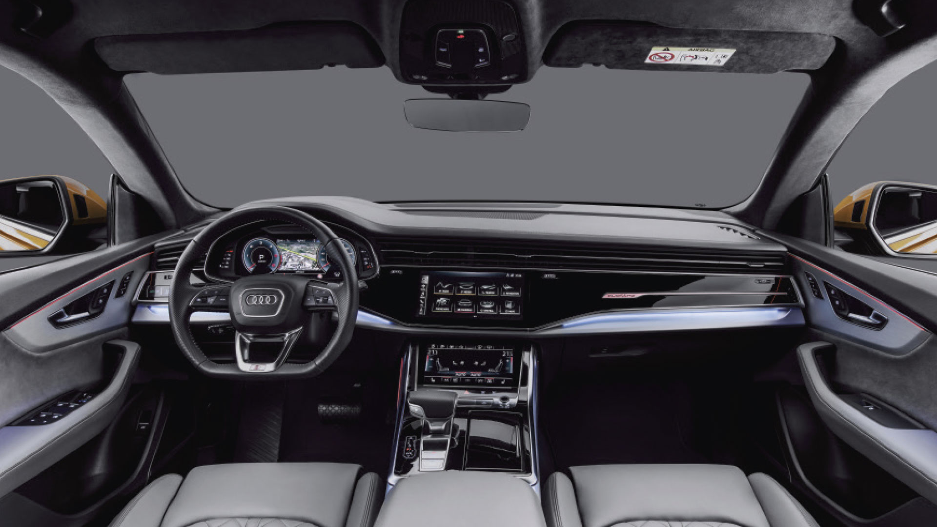 À l’intérieur, Audi nous habitue toujours à du grand niveau. Le Virtual Cockpit est évidemment présent, deux écrans sont présents sur la console centrale. Le design est épuré et élégant. Sous le capot, l’Audi Q8 reçoit un tout petit système d’hybridation (économies de carburant en ligne de mire). Pour le moment, seul le V6 3,0 L TDI de 286 chevaux est disponible. De série, le véhicule propose la transmission intégrale quattro tout comme une boîte automatique Tiptronic à 8 rapports, qui confère la puissance aux quatre roues directrices. D’autres motorisations viendront par la suite, pour renforcer le comportement dynamique du Q8, qui, selon les dires d’Audi, est déjà assez intéressant…
