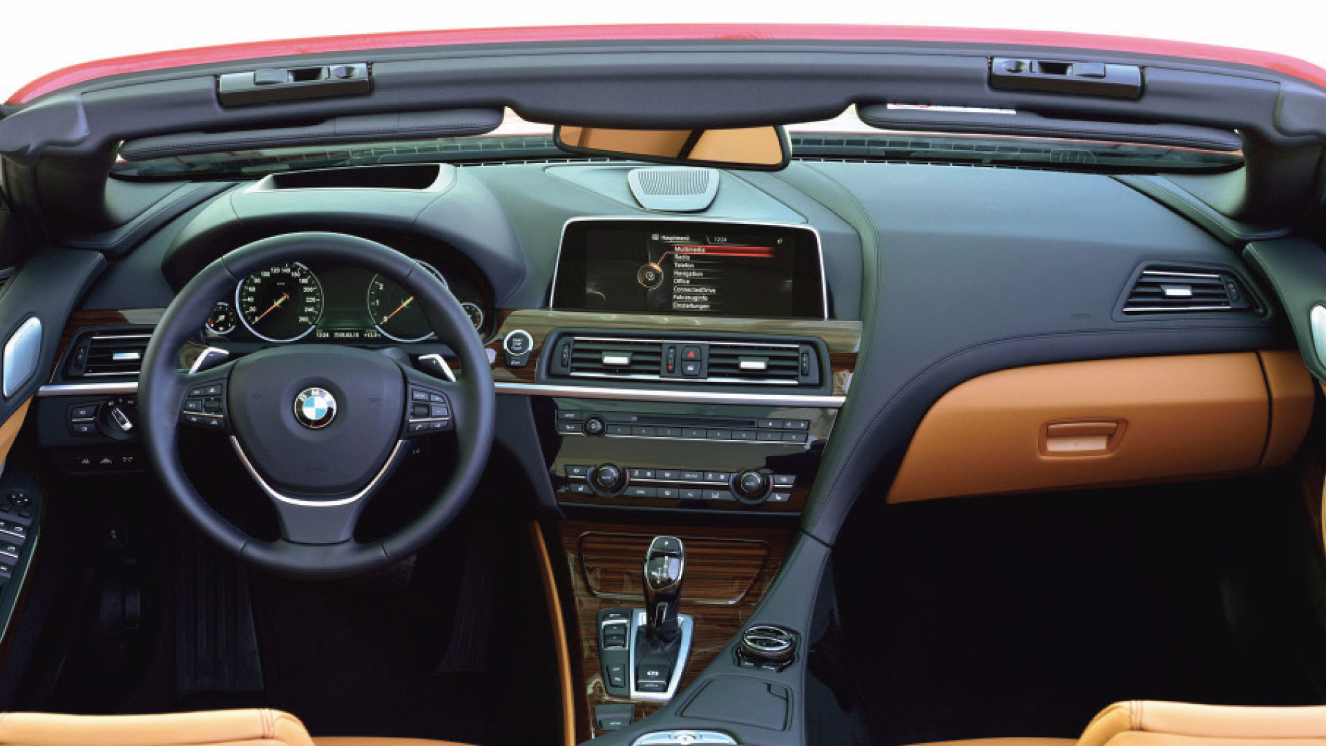 Sa double calandre inclinée vers l’avant donne l’impression d’un plongeon vers l’avant. Les nouveaux rétroviseurs extérieurs, avec rappel de clignotant, font partie des éléments caractéristiques qui font de la BMW Série 6 le cabriolet le plus exclusif du constructeur bavarois. La capote (disponible en 3 coloris) est entièrement automatique et possède une isolation à la fois thermique et acoustique. Elle s’ouvre en 19 secondes et se referme en 24 secondes, jusqu’à 40 km/h. Petit détail agréable : même en étant fermée, les cinq vitres peuvent être baissées, afin de procurer une sensation venteuse de liberté. L’intérieur évoque presque les yachts, avec l’utilisation de nombreuses boiseries. Plusieurs types de cuirs et des surfaces généreuses en font un cocon agréable.