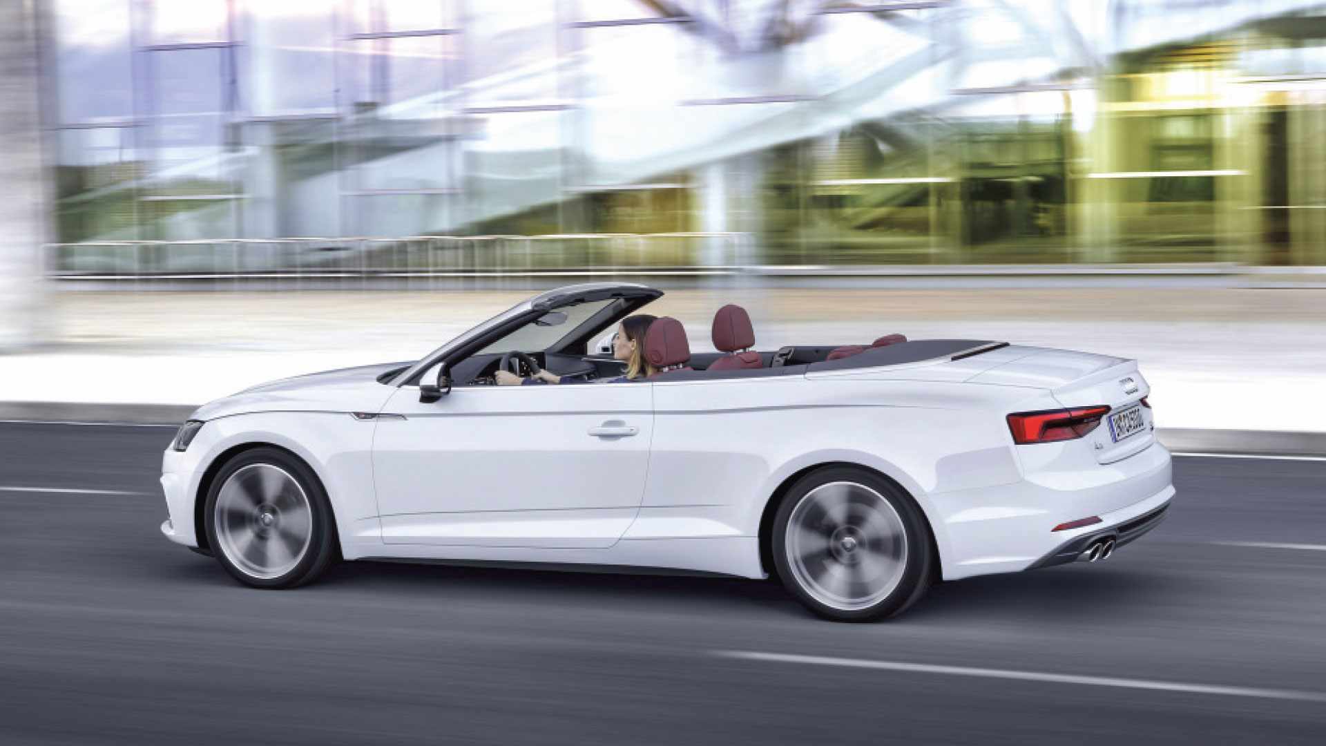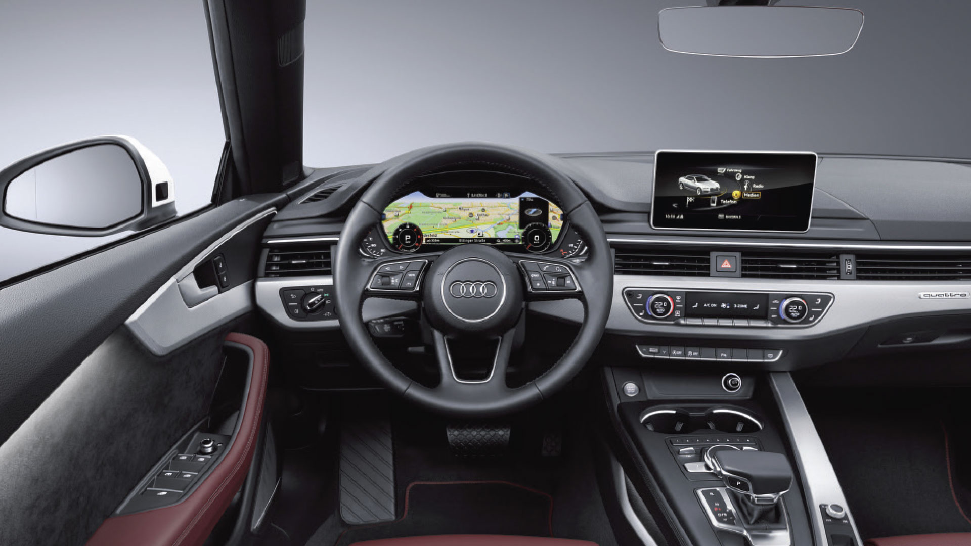 L’Audi A5 cabriolet gagne en espace et en confort. Les sièges sont partiellement en cuir et particulièrement confortables. Plusieurs équipements de série viennent améliorer le confort de vie, comme le système MMI radio avec écran couleur, ou encore des ceintures de sécurité avec microphones intégrés. De série, la capote en tissu permet une excellente isolation acoustique et thermique. Grâce au bouton “One Touch” une unique pression permet d’ouvrir automatiquement la capote en 15 secondes (fermeture en 18 secondes) jusqu’à 50 km/h. De quoi profiter pleinement des vertus de l’air frais et de la liberté de rouler les cheveux au vent. L’on remarque par ailleurs l’absence de toit rigide, une tendance qui se démocratise de plus en plus.