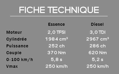 Véritable bijou de technologie, l’intelligence embarquée propose l’assistance adaptée et prend la main en cas d’urgence, préfigurant ainsi la conduite du futur avec une génération ou deux d’avance. En effet, l’arsenal d’équipements (suspension adaptative, système à 4 roues directrices, GPS intelligent…) est impressionnant et permet une conduite autonome de niveau 3. Sous le capot, Audi propose 4 moteurs différents (3 diesels et 1 essence), allant de 204 à 340 chevaux. Presque tous disposent de la transmission intégrale quattro (sauf le 2,0 TDI). Quant à la boîte, il s’agit soit d’une automatique 8 rapports soit une boîte S-Tronic à 7 rapports et double-embrayage.