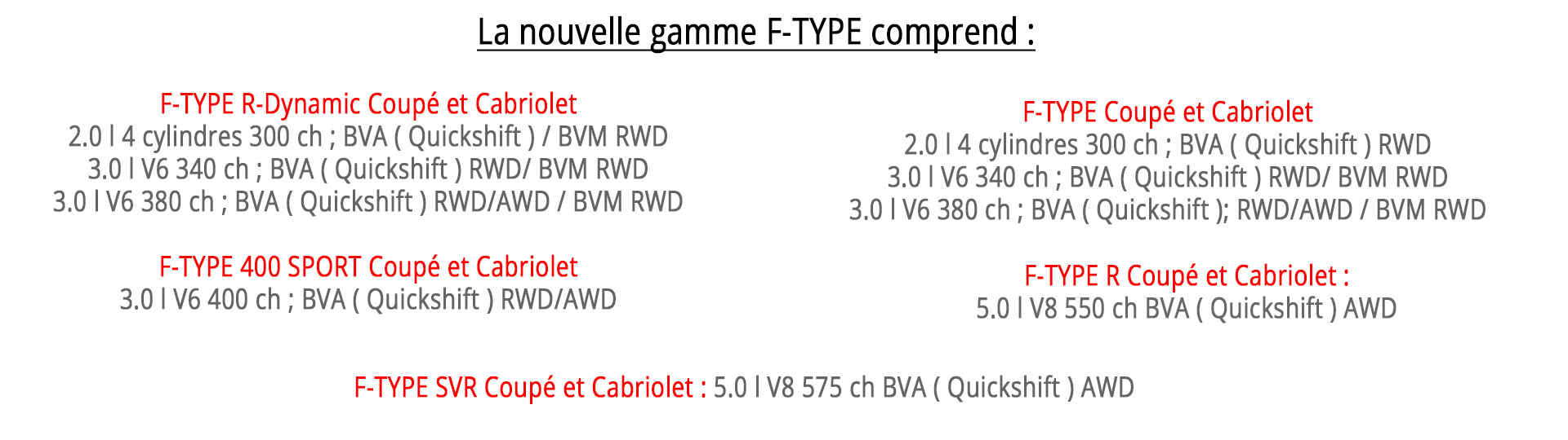 Jaguar introduit le moteur essence Ingenium 4 cylindres à la pointe de la technologie sur la F-TYPE. La famille F-TYPE s'étend maintenant du modèle 4 cylindres à la supercar capable d'atteindre 320 km/h, la F-TYPE SVR. L'association de la sportive biplace tout en aluminium avec un bloc moteur 2.0 litres turbo de 300 ch délivre l'ADN d’une Jaguar, avec une agilité accrue et une plus grande efficacité et accessibilité. C'est une vraie F-TYPE ayant son propre caractère. Le nouveau modèle conserve les performances attendues d’une F-TYPE et accélère de 0 à 100 km/h en seulement 5,7 secondes pour atteindre une vitesse de pointe de 249 km/h. Le couple maximal de 400 Nm du moteur turbocompressé, généré dès 1500 tr/min, couplé à la boîte Quickshift à huit rapports, offre une réponse exceptionnelle sur toute la plage de régimes. Le moteur Ingenium de 300 ch est non seulement le bloc 4 cylindres le plus puissant jamais proposé sur une Jaguar de production, mais il développe aussi le rendement spécifique le plus élevé de tous les moteurs de la gamme F-TYPE : 150 ch par litre, faisant de la F-TYPE le modèle le plus efficace de la gamme, avec une réduction de la consommation de 16 % par rapport au V6 de 340 ch, ainsi que des émissions de CO2 à seulement 163 g/km en cycle mixte européen. Une foule de technologies avancées permettent au moteur Ingenium d’offrir des performances exceptionnelles tout en limitant la consommation. Une distribution électrohydraulique de pointe est intégrée dans la culasse, avec des algorithmes de commande développés en interne. Cette technologie brevetée permet une commande entièrement variable de la levée des soupapes d'admission, favorisant une efficacité, une puissance et un couple performants sur toute la plage de régimes. Le collecteur d’échappement est intégré au moulage de la culasse. Le passage du frigorigène dans le collecteur réduit considérablement les temps de préchauffage, et donc la consommation et les émissions. Le collecteur est associé à un turbocompresseur à deux volutes (« Twin scroll »). Ce type de conception prévient les interférences entre les pulsations d’échappement, en veillant à ce que la roue de la turbine réagisse beaucoup plus rapidement : la pression de suralimentation est fournie presque instantanément, ce qui induit un décalage presque inexistant du turbo et garantit la réactivité indissociable de la F-TYPE. Comme tous les membres de la famille Ingenium, le bloc moteur 300 ch de la F-TYPE a été conçu et développé en interne. Il est produit au Royaume-Uni au Centre de fabrication des moteurs de Jaguar Land Rover (une usine ayant nécessité un investissement d'un 1 milliard £ ), aux côtés des moteurs essence à 4 cylindres de 200 ch et 250 ch, et des moteurs diesel quatre cylindres de 150 ch, 163 ch, 180 ch et 240 ch. L'introduction du 4 cylindres ne signifie pas pour autant que les conducteurs perdent des sensations de conduite ou le plaisir sonore que peut procurer ce véhicule. Un échappement actif minutieusement réglé est de série sur les modèles F-TYPE d’entrée de gamme, tandis que les versions R-Dynamic comportent un échappement actif modulable.
