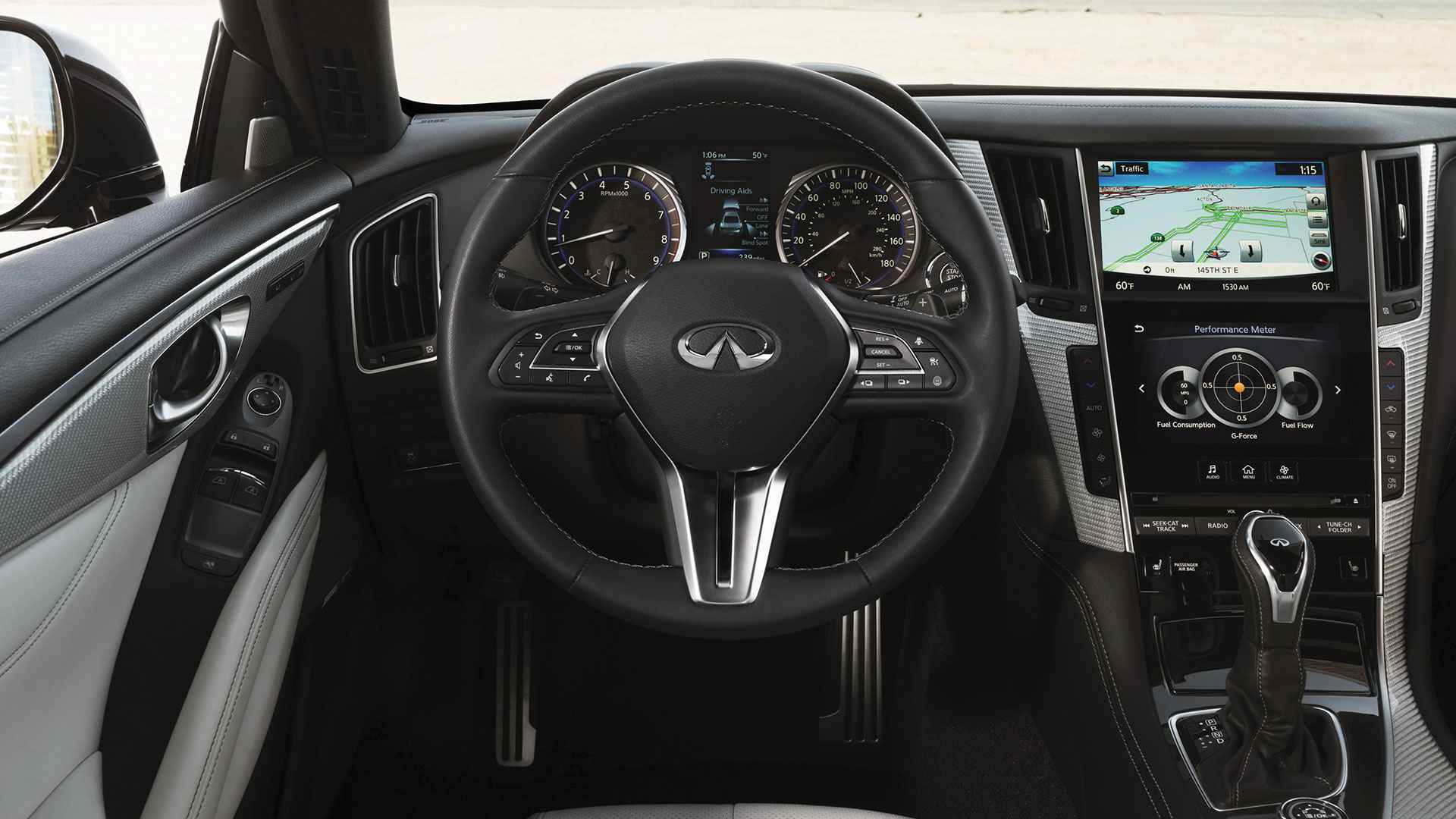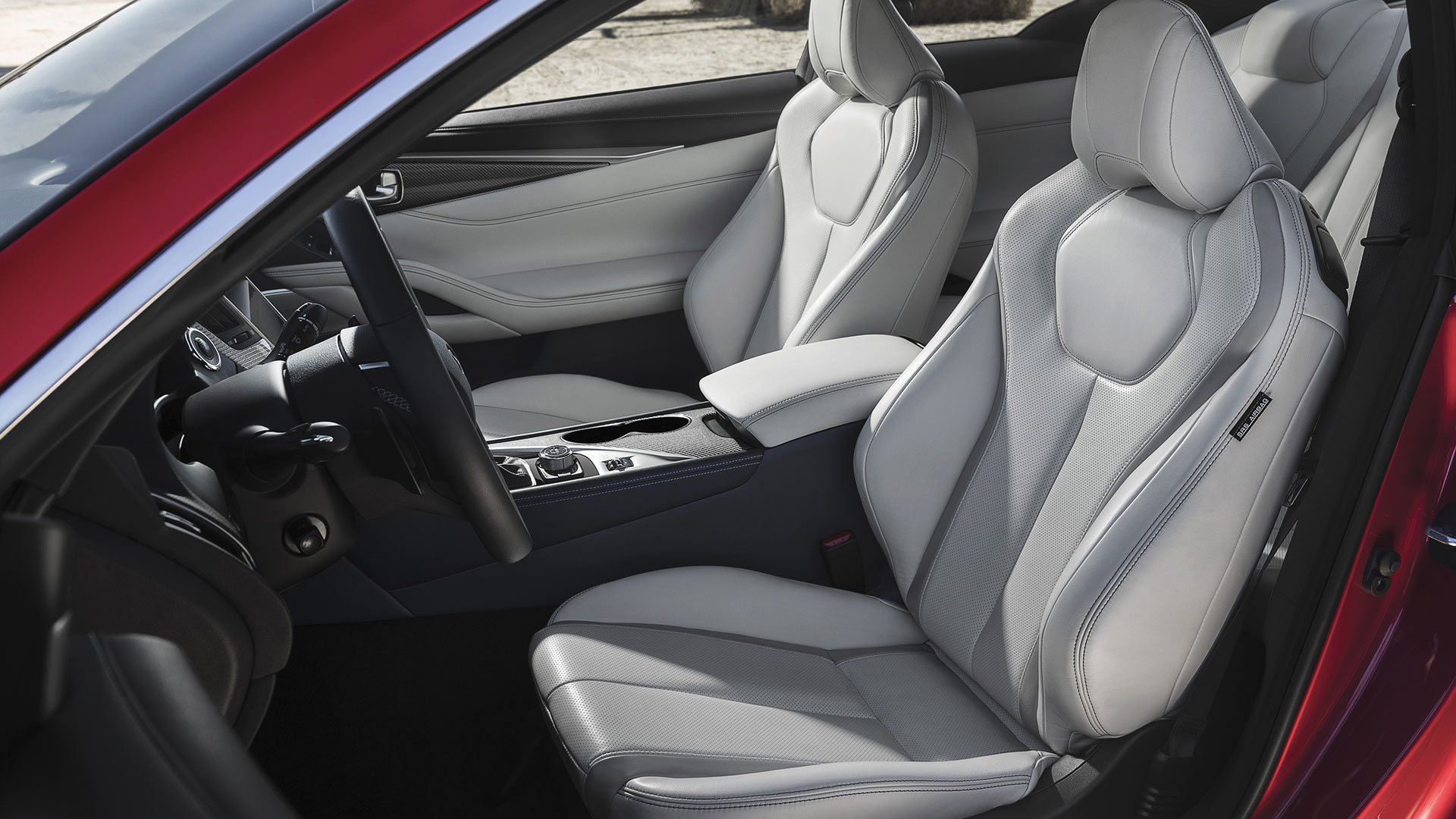Sous le capot, le Q60 sait se montrer joueur et donner du répondant. Nous retrouvons deux blocs moteurs. Dâune part un bloc essence 2,0 L qui développe 211 chevaux pour 350 Nm de couple) et un moteur maison V6 à double turbocompresseur. Celui-ci développe 405 ch, bien que la sonorité reste assez douce pour un modèle à vocation sportive. Une boîte automatique à 7 rapports est associée de série à tous les modèles. Petit bijou de technologie, le Q60 offre une suspension dynamique numérique, mais aussi un nouveau type de direction (optionnel, et de série sur le V6). Il sâagit dâune direction adaptative électronique (ou direction digitale), et non pas mécanique. Ceci veut dire que la colonne de direction est désolidarisée du volant, et permet dâobtenir des réponses plus fluides et instinctives, quand bien même parfois les retours dâinformations sont trompeurs.