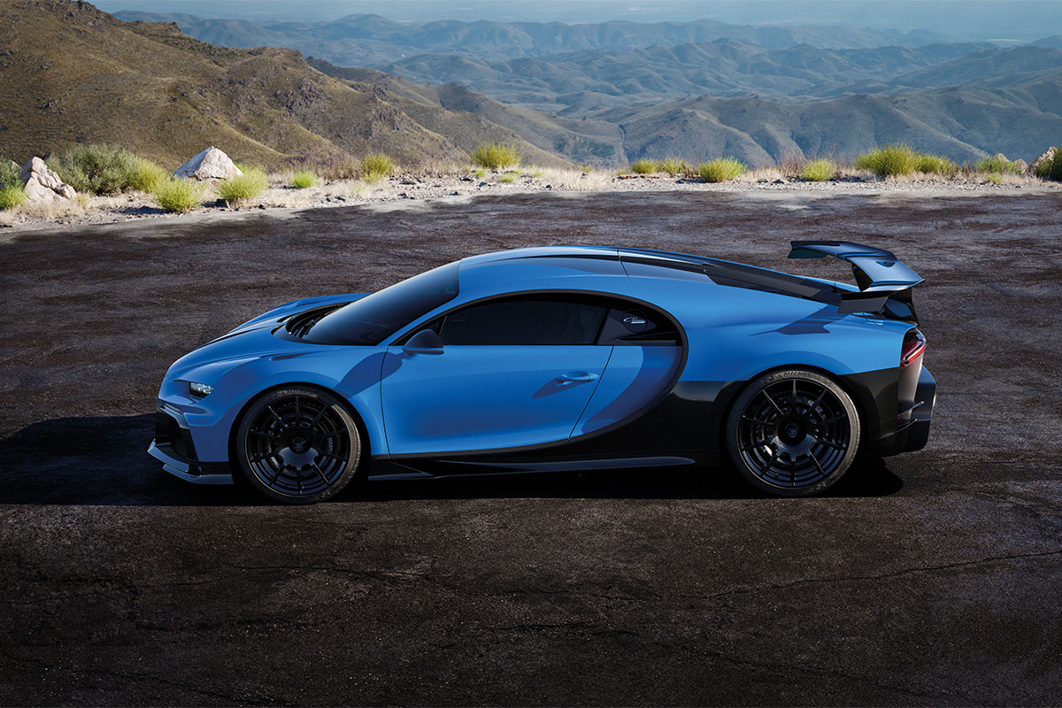 Sous le capot, Bugatti nous propose son W16 8,0 Litres à quatre turbos entièrement remanié, qui développe ici 1500 chevaux pour un couple encore plus grand : 1600 Nm. Du fait des innovations techniques dont l’auto bénéficie (suspensions raffermies, pneumatiques modifiés, nouvelle boîte de vitesses DSG7), la Chiron Pur Sport abat le 0 à 100 km/h en 2,3 secondes (soit 0,2 secondes plus rapide qu’une Chiron “basique”). Imperceptible pour le commun des mortels, mais là réside la philosophie du dépassement de soi. La vitesse de pointe a été bridée électroniquement pour ne pas dépasser les 350 km/h.