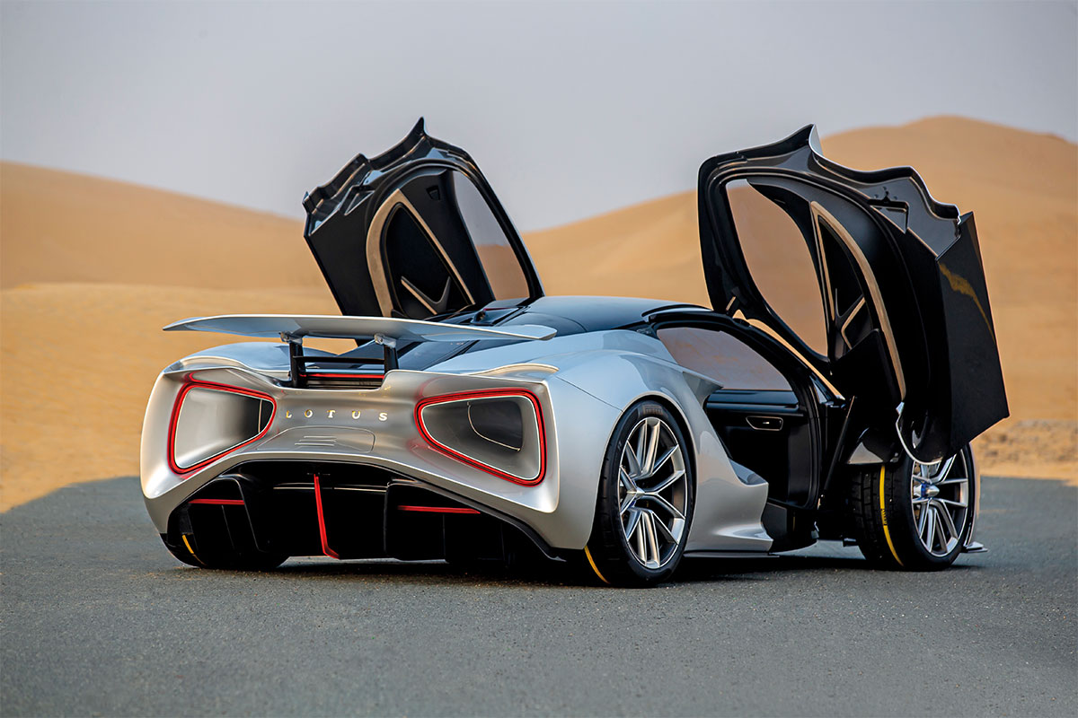 L’Evija est une bête aérodynamique reposant sur une plateforme monocoque en fibre de carbone (au poids limité à 130 kg). Ses lignes s’inspirent ouvertement du monde de la course automobile, avec des lignes athlétiques majestueuses. La signature lumineuse arrière, entourant des trous béants creusés à même la carrosserie et permettant un flux d’air, est particulièrement caractéristique du modèle.