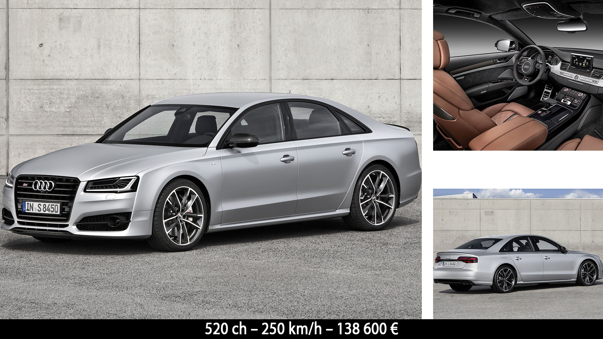 Audi dispose, dans sa gamme, d’une berline aux performances époustouflantes, la S8 ! La S8 est une voiture de luxe qui cache bien son jeu. Sous des allures de berline de monsieur tout le monde, elle propose un V8, quatre litres de cylindrée et développant 520 chevaux ! Volontairement limitée à 250 km/h, elle navigue sans bruit, sans fioriture et elle avale tout ce qui l’entoure. Sur route, et plus encore, sur autoroute, c’est la routière parfaite, elle vous emmène à des chronos incroyables en toute quiétude, l’air de rien, un must ! Impériale sur autoroutes et sur grands axes avec un confort optimal, cette S8 est loin d’être ridicule sur routes plus tortueuses.