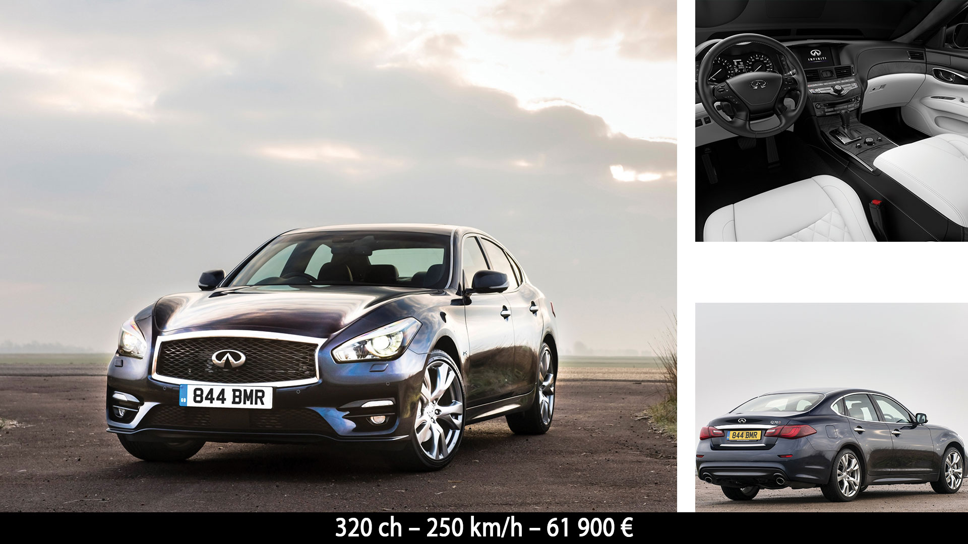 Magique Conçue pour offrir les performances d'un moteur V8 haut de gamme et le rendement énergétique d'un moteur 4 cylindres, la technologie Direct Response Hybrid d’Infiniti remet en question les idées reçues pour se présenter comme une motorisation adaptée aux conducteurs les plus aguerris. Elle permet de passer du mode tout électrique au mode hybride intégral avec une intensité et un temps de réponse qui remettent en question toutes les idées que vous pouvez avoir sur les hybrides. 364 ch – 250 km/h – 57 800 € Fiche technique: Moteur V6/hybride Cylindrée 3 498 cm3 Puis. 364 ch Couple 350 Nm 0 – 100 km/h 5,3 s