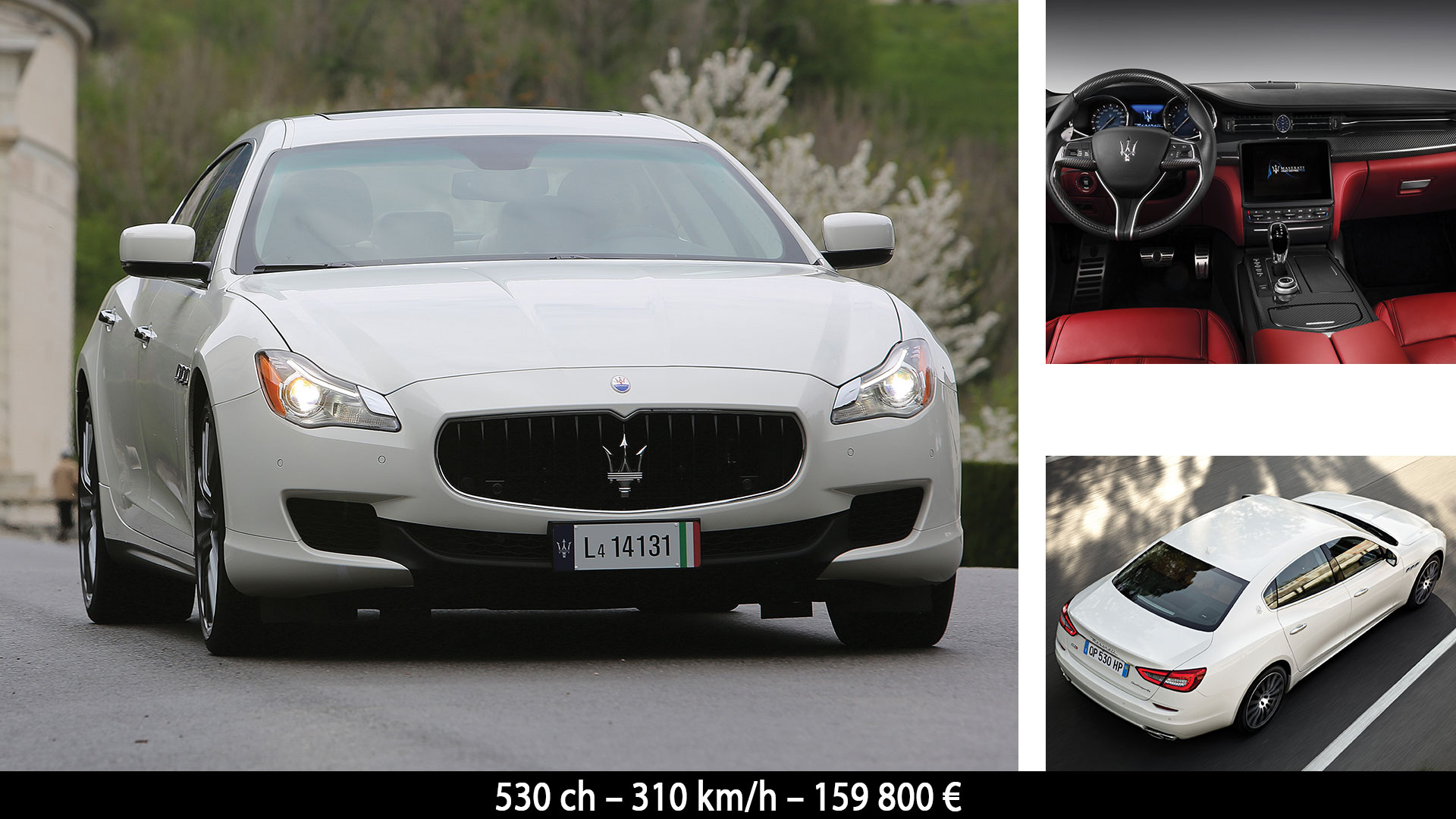 Allure dynamique En dépit de sa taille impressionnante, la Quattroporte garde une allure équilibrée et dynamique, de la calandre Maserati qui a été revisitée à l’avant jusqu’aux feux LED à l’arrière. Les pare-chocs avant et arrière, dont le design a été revu, donnent encore plus d’autorité et de présence à la voiture, tandis que les trois bouches d’aération traditionnelles de la marque apparaissent sur les côtés. 275 ch – 250 km/h – 98 450 € Fiche technique: Moteur V6 Cylindrée 2 987 cm3 Puis. 275 ch Couple 600 Nm 0 – 100 km/h 6,4 s