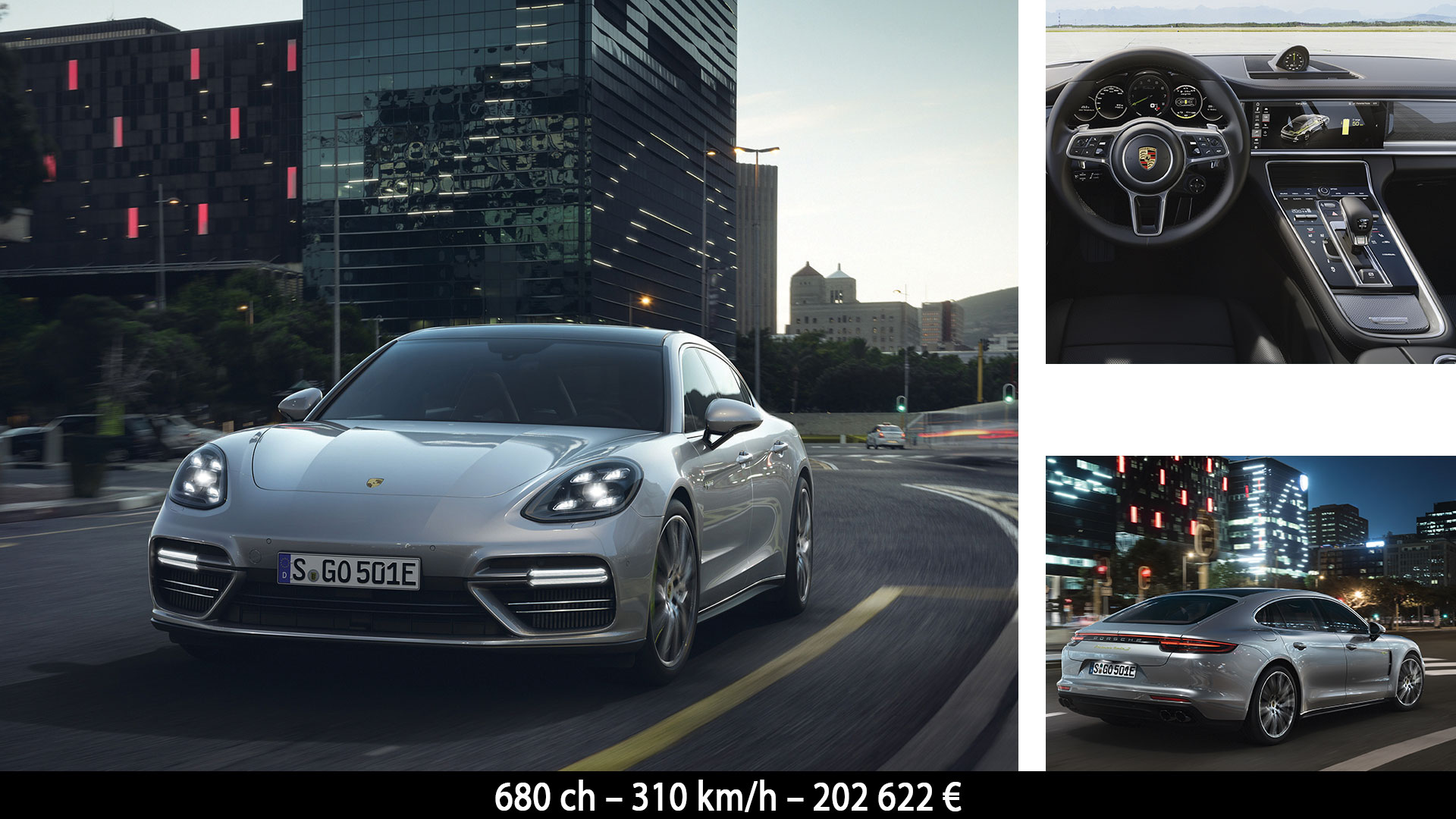 Existe aussi en version Sport Turismo. La silhouette et les proportions des nouveaux modèles Panamera sont plus Porsche que jamais. Des lignes claires et une silhouette sportive plus affûtée soulignent la précision du nouveau design. L’empattement est plus long par rapport au modèle précédent, le porte-à-faux plus court à l’avant et celui à l’arrière plus long, ce qui lui confère un aspect encore plus dynamique. La sculpture plus prononcée des côtés révèle une taille et une légèreté typiquement Porsche. 422 ch – 285 km/h – 121 500 € Fiche technique: Moteur V8 Cylindrée 3 956 cm3 Puis. 422 ch Couple 850 Nm 0 – 100 km/h 4,5 s