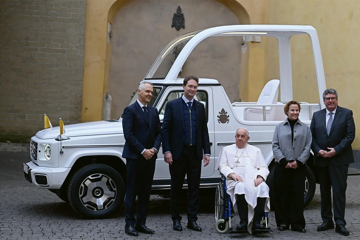 Fournisseur depuis de nombreuses années des véhicules du Vatican, la voiture officielle du pape fait peau neuve et passe à l’électrique. Sur base de Classe G électrique, le constructeur à l’étoile dévoile la nouvelle papamobile d’un blanc clinique. Entièrement recarrossée afin d’accueillir un grand siège blanc pivotant en son centre, l’auto intègre un système de capote amovible. Le groupe motopropulseur a été légèrement modifié pour s’adapter aux déplacements à basse vitesse du pape, quand bien même nous savons que les 580 chevaux de l’allemande resteront disponibles en cas de besoin urgent.