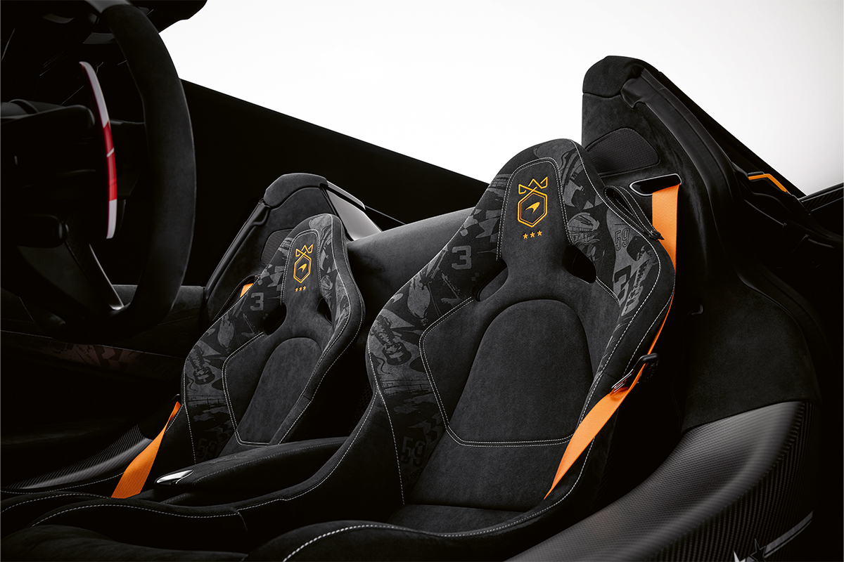 L’intérieur est celui d’une McLaren 750s, mais avec de nombreux éléments personnalisés par MSO. Pour commencer, les sièges baquets noirs avec surpiqures oranges sont en carbone et arborent un logo spécial : la triple couronne. Ils permettent aisément de s’imaginer à la place de Johnny Rutherford en 1974, s’attaquant à Indianapolis. Aussi, vous pourrez remarquer une plaque sur le montant de porte issue de la carrosserie d’une vraie Formule 1 McLaren (probablement pas la MP4/2 n°7 d’Alain Prost, ceci dit).