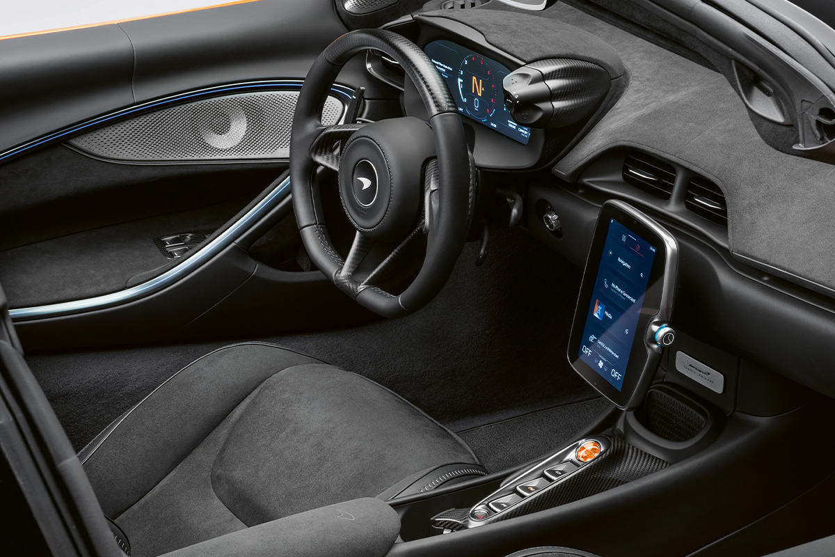Dans l’habitacle, peu de choses changent par rapport au coupé, si ce n’est la possibilité d’avoir un système audio Bowers & Wilkins (optionnel). D’emblée, McLaren proposera trois finitions (Performance, TechLux et Vision). Le toit électrique (qui peut posséder un panneau de verre électrochrome) s’ouvre et se ferme en 11 secondes, tout en roulant jusqu’à 50 km/h. McLaren annonce une autonomie de 34 km en tout-électrique grâce à sa batterie de 7,4 kW, sans avoir à solliciter le 6 cylindres biturbo.