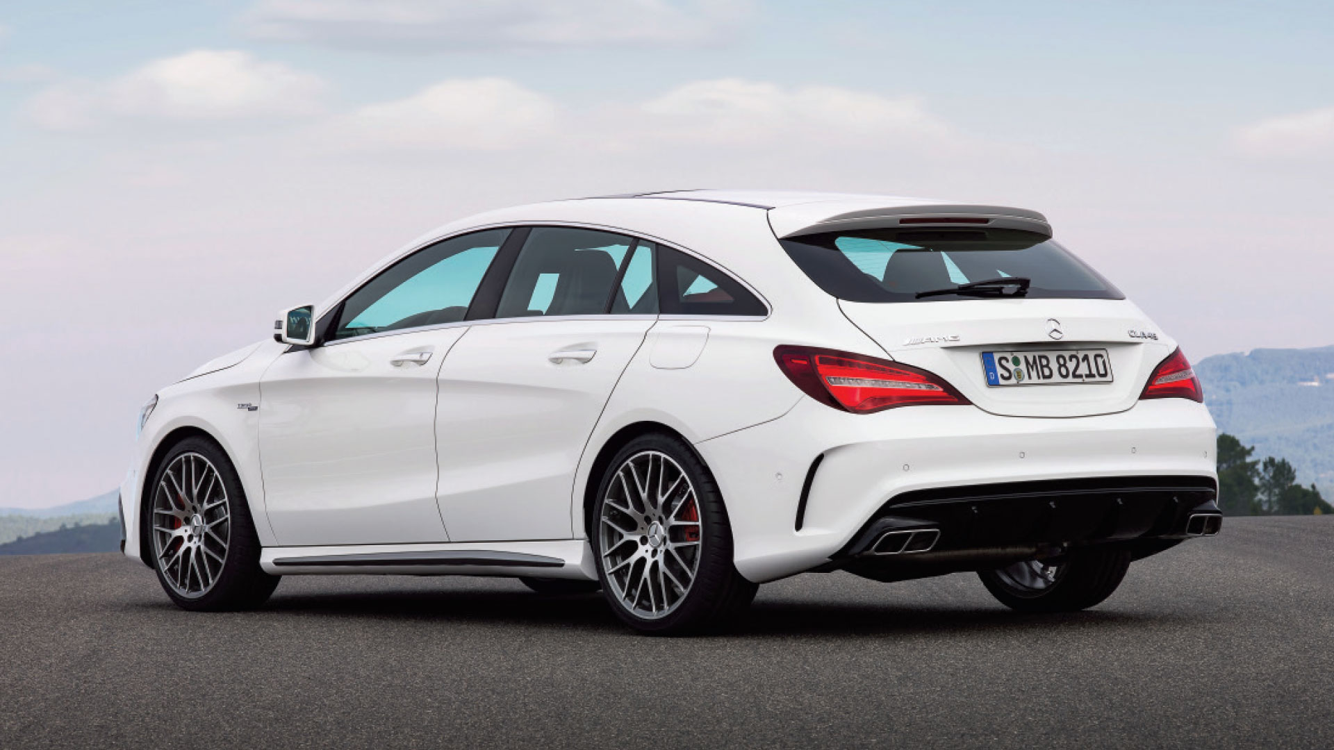 La Mercedes-AMG CLA 45 Shooting Brake est basée sur l’ancienne génération du CLA, dont elle est la version ultime en carrosserie break de chasse. Ses feux arrière sont pourtant plus agressifs, mais ne sont pas intégrés au hayon comme sur la nouvelle génération de CLA 45. Les quadruples pots d’échappement sont typés sport avec leur forme rectangulaire. La face avant possède les anciennes calandres, avec la barrette AMG horizontale avec l’étoile Mercedes en son centre.