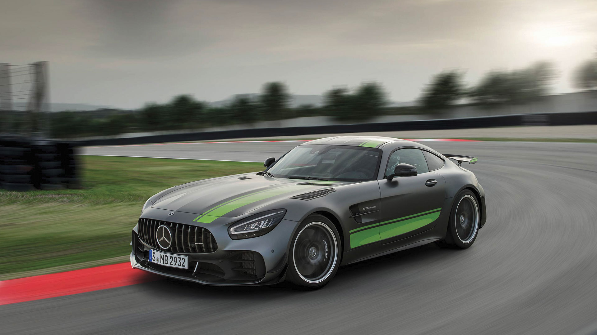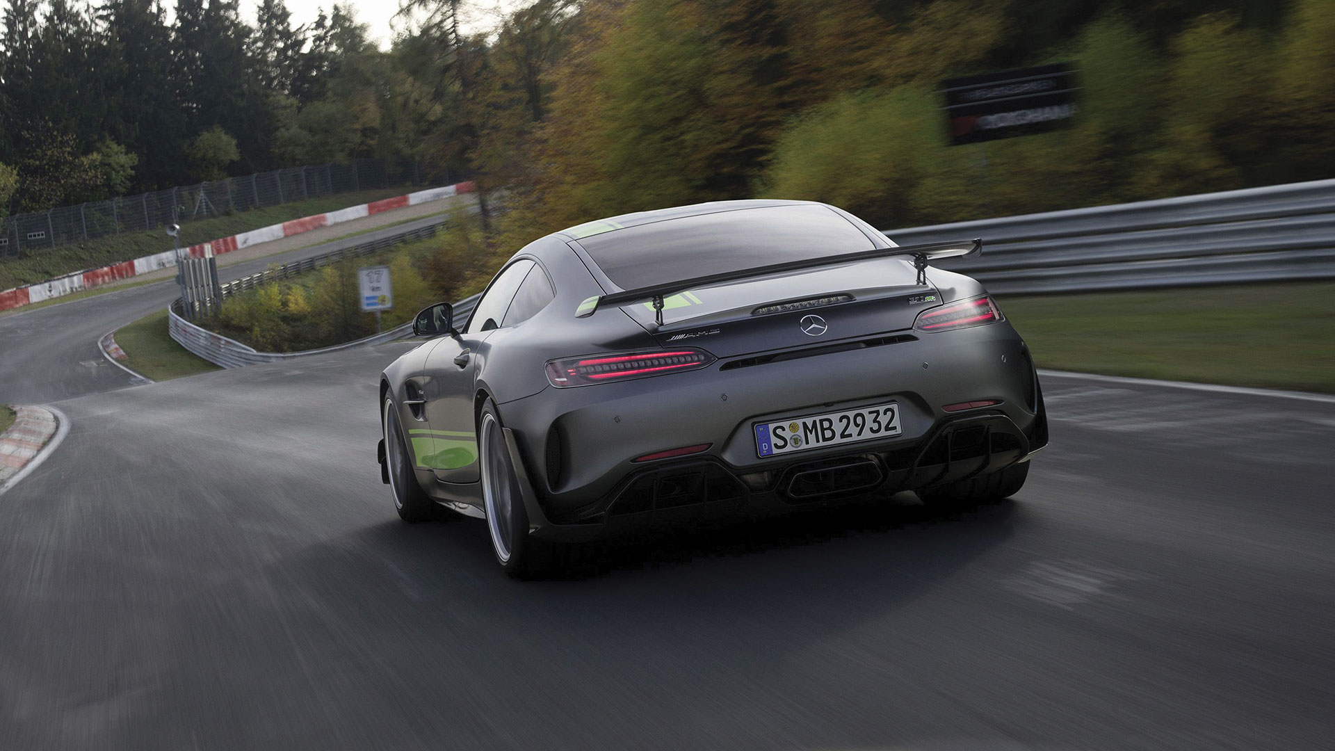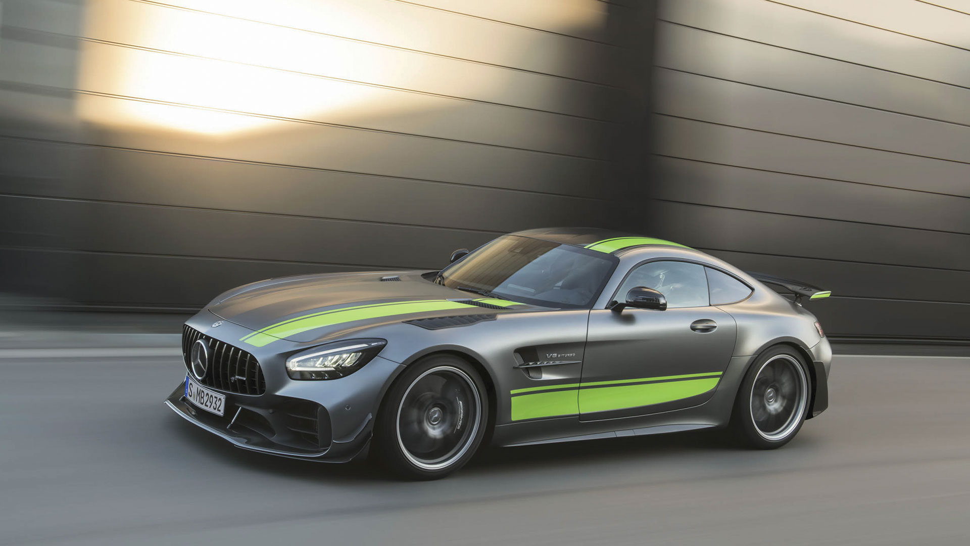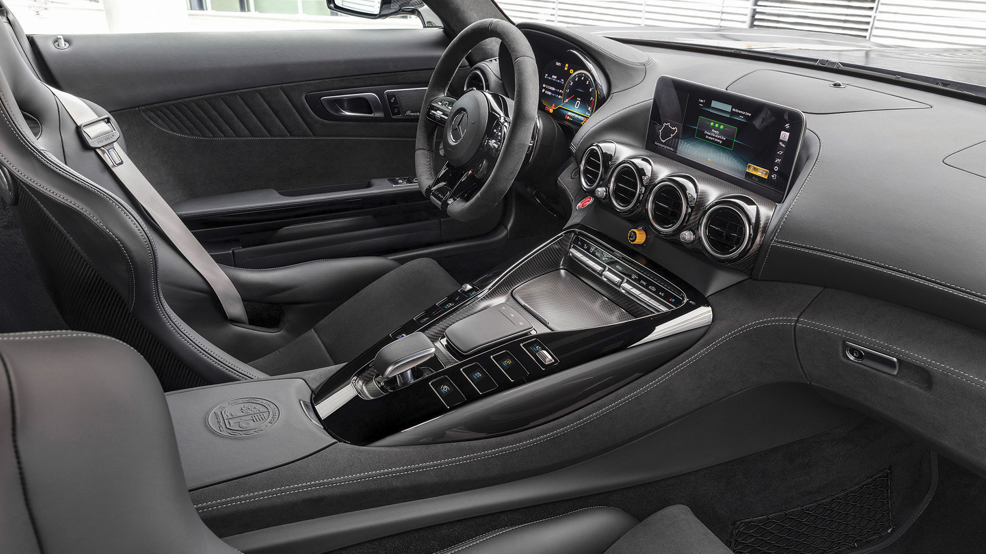 Les changements et évolutions visuelles sont très minimes et légères, presque imperceptibles. Elles sont le plus marquées sur la face avant, avec ces ailettes et ce bouclier remodelé ainsi qu’une nouvelle calandre. Heureusement qu’il y a ces bandes décoratives et un logo R encadré dans un drapeau à damiers pour la différencier. À l’intérieur de l’habitacle, cette AMG GT R PRO est très digitale. Trois ambiances y sont proposées : Classic, Sporty et Supersport. Un nouveau gadget (AMG Track Pace) vous donne des données relatives à vos sorties circuit, tout en proposant des conseils. Comme nous vous le disions, l’auto est typée piste. Ses réglages de suspension et l’aérodynamisme ont été retravaillés. Plusieurs packs sont disponibles, allant jusqu’à proposer un harnais à quatre points, un extincteur ou encore un arceau de sécurité. Sous le capot, on retrouve les mêmes blocs V8 de l’AMG GT, avec différents niveaux de puissance, allant de 476 chevaux à 585 chevaux (AMG GT R et GT R PRO). La différence avec la AMG GT R est donc assez minime, c’est une véritable chasse aux kilos en attendant la version Black Series.