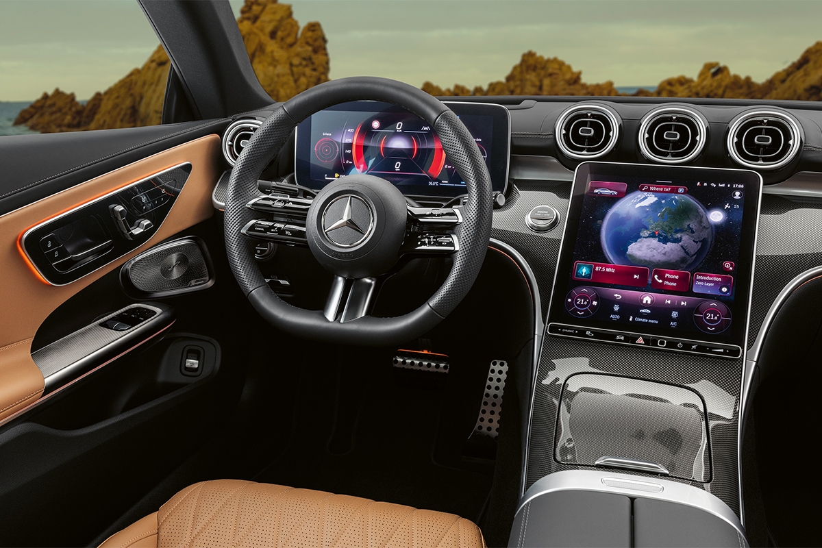 Dans l’habitacle, l’espace a été grandement amélioré par rapport à la Classe C coupé grâce à un empattement supérieur (+25 mm). Les sièges sont exclusifs, intégrant des haut-parleurs sur les appuie-tête, diffusant le système audio Burmester. C’est la première fois chez Mercedes que les sièges arrière sont accessibles grâce au déverrouillage d’une boucle en Nappa sur le bord supérieur du siège avant (fonction Easy-Entry). Aussi, la polyvalence est au rendez-vous avec un coffre de 420L. On retrouve l’intérieur de la Classe C, avec une tablette verticale 12 pouces au milieu de la console centrale s’inclinant vers le conducteur. La dernière génération du système MBUX est intégrée.