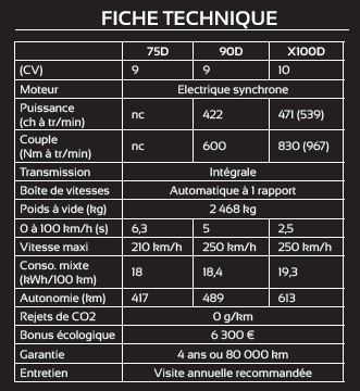 Tesla modernise le SUV Peu connu en Europe, Tesla a voulu se faire un nom avec ce Mondial cuvée 2016. Doté de la transmission intégrale et d'une batterie de 100 kWh, qui lui permettra d'avoir 542 km d'autonomie, dont 300 à 400 sur autoroute, ce Model X a déjà pris un temps d'avance sur la concurrence en prenant le pari de l'érgonomique. La marque étasunienne a spécifiquement pensé à l'espace en développant ce modèle basé sur la Model S, son premier SUV. Sept adultes pourront s'installer dans ce nouveau véhicule (2 à l'avant, 3 au centre, 2 à l'arrière), sans que le volume du coffre ne soit réellement impacté. Le système Falcon rend le Model X unique Sur le papier, le véhicule embarque la même motorisation électrique que la Model S et remplace la carrosserie de berline sportive par un habitacle de type SUV. Toute la mécanique qui gère la poussée du véhicule est celle de la Model S, mais cela n’empêche pas la Model X de se distinguer par bien des aspects — et on en attend beaucoup d’un véhicule de 80 700 à plus de 150 000 euros.