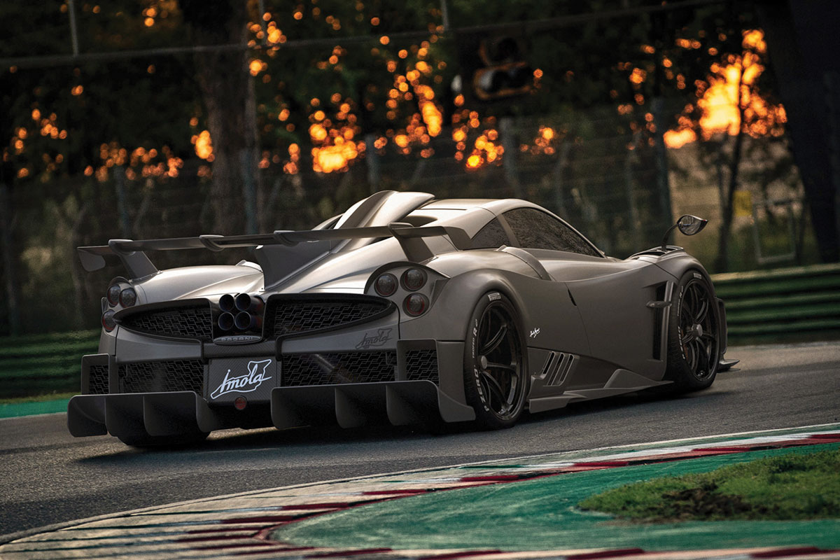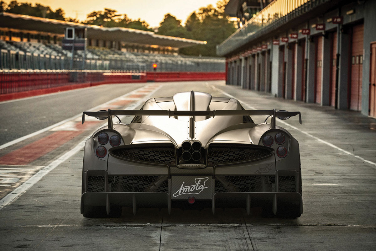 Esthétiquement, la Pagani Huayra Imola est assez vulgaire puisqu’elle s’éloigne des lignes assez pures et sculptées par le dieu du vent de la Huayra. De multiples appendices aérodynamiques font leur apparition, avec notamment la présence de boucliers avant et arrière modifiés, ainsi que d’un extracteur d’air énorme façon Zonda R. Les feux arrière sont noircis, tandis que l’aileron s’inspire de celui de la BC mais est bel et bien unique en son genre. Par ailleurs, Horacio Pagani, le PDG de la marque italienne, avoue que la Huayra Imola a sacrifié son élégance sur l’autel de l’efficacité, avec la présence d’aérodynamique active. Un nouveau travail sur la peinture permet de faire gagner 5 kg sur la balance tout en conservant la richess et et la profondeur des couleurs.