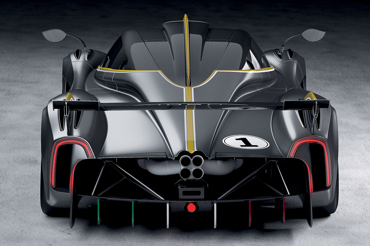 Les lignes de cette Huayra R reprennent évidemment les coups de dessin de la Huayra de façon générale, mais sa face arrière est complètement modifiée. De nouvelles prises d’air apparaissent sur le cabot et permettent de mieux refroidir les freins carbone-céramique. Beaucoup plus longue, avec un arrière allongé, ses feux ont été modifiés, avec un extracteur et un diffuseur (aux couleurs italiennes) massifs. L’aileron arrière est beaucoup plus fin que ce à quoi on pourrait s’imaginer, mais joue certainement en faveur de la performance. Les mythiques pots d’échappement de forme ronde sont évidemment conservés.