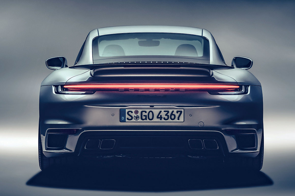 L’auto repose sur la plateforme MMB (qu’elle partage avec les 718 Boxster et Cayman). Esthétiquement, la huitième génération de la 911 n’est pas fondamentalement différente de sa devancière mis à part un gabarit quelque peu élargi. Pourtant, certains détails caractéristiques permettent aisément de l’identifier parmi toutes les autres. À commencer par l’arrière : une barre LED de feu à feu sous une grille d’aération accueillant un troisième feu vertical sauront la rendre immédiatement reconnaissable. De plus, l’aileron escamotable agrandi passerait presque inaperçu face aux immenses sorties d’échappement situées légèrement plus haut. Le capot avant est nervuré, le bouclier redessiné, tandis que de profil, nous remarquons des poignées de portes affleurantes malgré une silhouette inchangée depuis ses débuts.