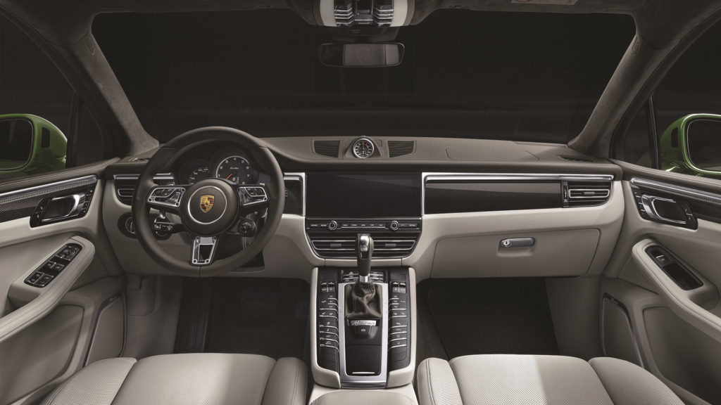 Le Macan Turbo reçoit des sièges sport à réglage électrique et un toit en alcantara. Plusieurs inserts en aluminium viennent renforcer la sportivité, tout comme le volant sport qui n’est pas sans rappeler celui d’une 911 type 992.