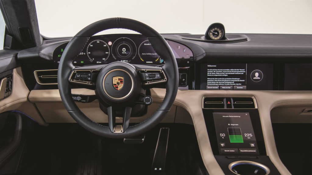 Dans l’habitacle, nous nous retrouvons dans un espace assez spacieux bardé de nombreux écrans : compteur numérique (le seul qui ne soit pas tactile), les deux écrans centraux, l’écran passager, et l’écran arrière central. Un système de commande vocale est présent activable via “Hey Porsche”. D’après la volonté de Porsche, la sellerie n’est pas exclusivement en cuir. L’auto possède deux coffres pour un volume total d’environ 450 L.